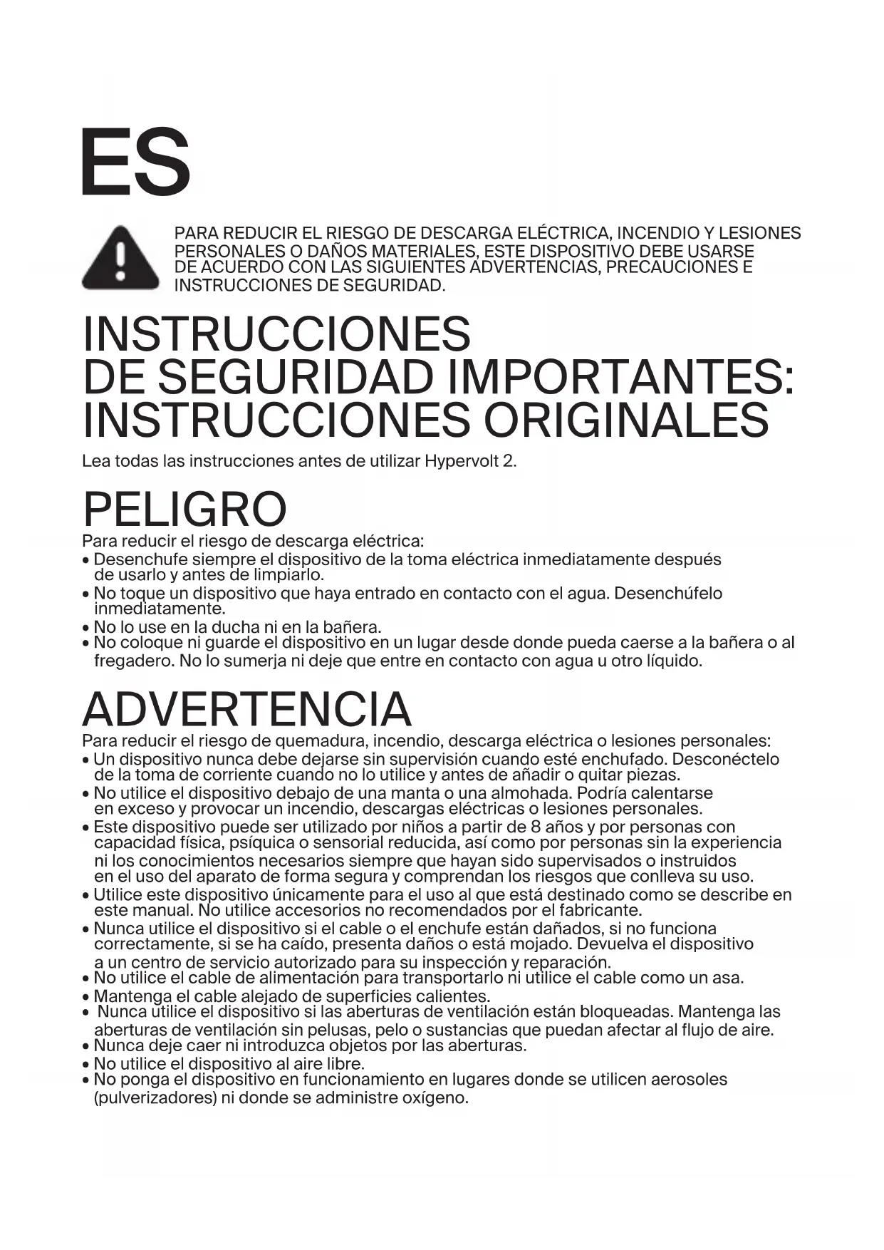 7ES PARA REDUCIR EL RIESGO DE DESCARGA ELÉCTRICA, INCENDIO Y LESIONES PERSONALES O DAÑOS MATERIALES, ESTE DISPOSITIVO DEBE USARSE DE ACUERDO CON LAS SIGUIENTES ADVERTENCIAS, PRECAUCIONES E INSTRUCCIONES DE SEGURIDAD. INSTRUCCIONES DE SEGURIDAD IMPORTANTES: INSTRUCCIONES ORIGINALES Lea todas las instrucciones antes de utilizar Hypervolt2. PELIGRO Para reducir el riesgo de descarga eléctrica: