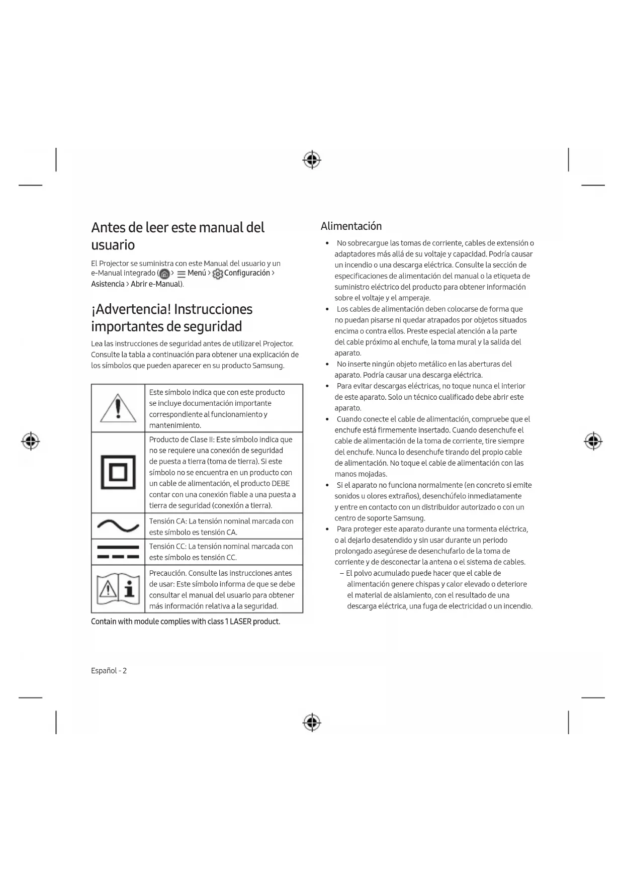 - Deze licenties worden mogelijk niet ondersteund, afhankelijk van het model of de regio. The terms HDMI and HDMI High-Definition Multimedia Interface, and the HDMI Logo are trademarks or registered trademarks of HDMI Licensing Administrator, Inc. in the United States and other countries.Deze pagina is opzettelijk leeg gelaten.Español - 2 Antes de leer este manual del usuario El Projector se suministra con este Manual del usuario y un e-Manual integrado ( > Menú > Configuración > Asistencia > Abrir e-Manual). ¡Advertencia! Instrucciones importantes de seguridad Lea las instrucciones de seguridad antes de utilizar el Projector. Consulte la tabla a continuación para obtener una explicación de los símbolos que pueden aparecer en su producto Samsung. Este símbolo indica que con este producto se incluye documentación importante correspondiente al funcionamiento y mantenimiento. Producto de Clase II: Este símbolo indica que no se requiere una conexión de seguridad de puesta a tierra (toma de tierra). Si este símbolo no se encuentra en un producto con un cable de alimentación, el producto DEBE contar con una conexión fiable a una puesta a tierra de seguridad (conexión a tierra). Tensión CA: La tensión nominal marcada con este símbolo es tensión CA. Tensión CC: La tensión nominal marcada con este símbolo es tensión CC. Precaución. Consulte las instrucciones antes de usar: Este símbolo informa de que se debe consultar el manual del usuario para obtener más información relativa a la seguridad. Contain with module complies with class 1 LASER product. Alimentación