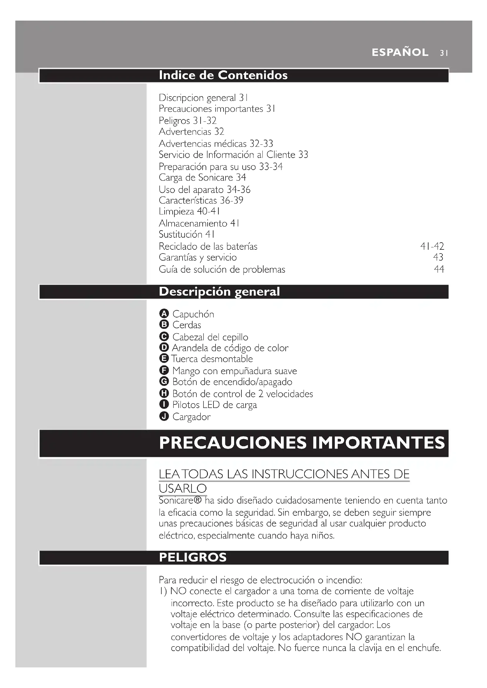USARLO Sonicare\ ha sido diseñado cuidadosamente teniendo en cuenta tanto la eficacia como la seguridad. Sin embargo, se deben seguir siempre unas precauciones básicas de seguridad al usar cualquier producto eléctrico, especialmente cuando haya niños. PELIGROS Para reducir el riesgo de electrocución o incendio: