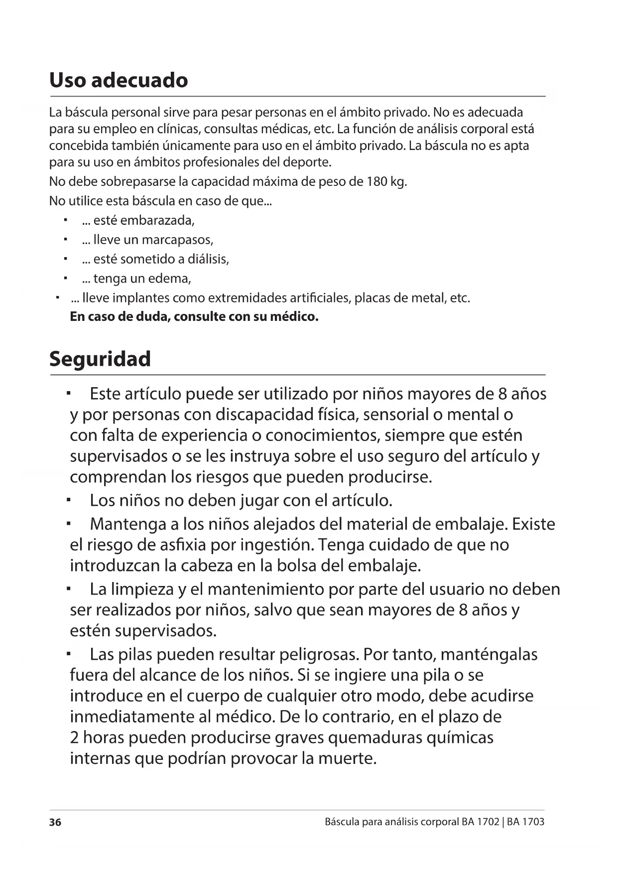 Báscula para análisis corporal BA 1702 | BA 1703 Uso adecuado La báscula personal sirve para pesar personas en el ámbito privado. No es adecuada para su empleo en clínicas, consultas médicas, etc. La función de análisis corporal está concebida también únicamente para uso en el ámbito privado. La báscula no es apta para su uso en ámbitos profesionales del deporte. No debe sobrepasarse la capacidad máxima de peso de 180 kg. No utilice esta báscula en caso de que... ... esté embarazada, ... lleve un marcapasos, ... esté sometido a diálisis, ... tenga un edema, ... lleve implantes como extremidades articiales, placas de metal, etc. En caso de duda, consulte con su médico. Seguridad Este artículo puede ser utilizado por niños mayores de 8 años y por personas con discapacidad física, sensorial o mental o con falta de experiencia o conocimientos, siempre que estén supervisados o se les instruya sobre el uso seguro del artículo y comprendan los riesgos que pueden producirse. Los niños no deben jugar con el artículo. Mantenga a los niños alejados del material de embalaje. Existe el riesgo de asxia por ingestión. Tenga cuidado de que no introduzcan la cabeza en la bolsa del embalaje. La limpieza y el mantenimiento por parte del usuario no deben ser realizados por niños, salvo que sean mayores de 8 años y estén supervisados. Las pilas pueden resultar peligrosas. Por tanto, manténgalas fuera del alcance de los niños. Si se ingiere una pila o se introduce en el cuerpo de cualquier otro modo, debe acudirse inmediatamente al médico. De lo contrario, en el plazo de 2horas pueden producirse graves quemaduras químicas internas que podrían provocar la muerte. Koerperanalysewaage 170x.indb 36 19.01.2018 13:41:55Seguridad