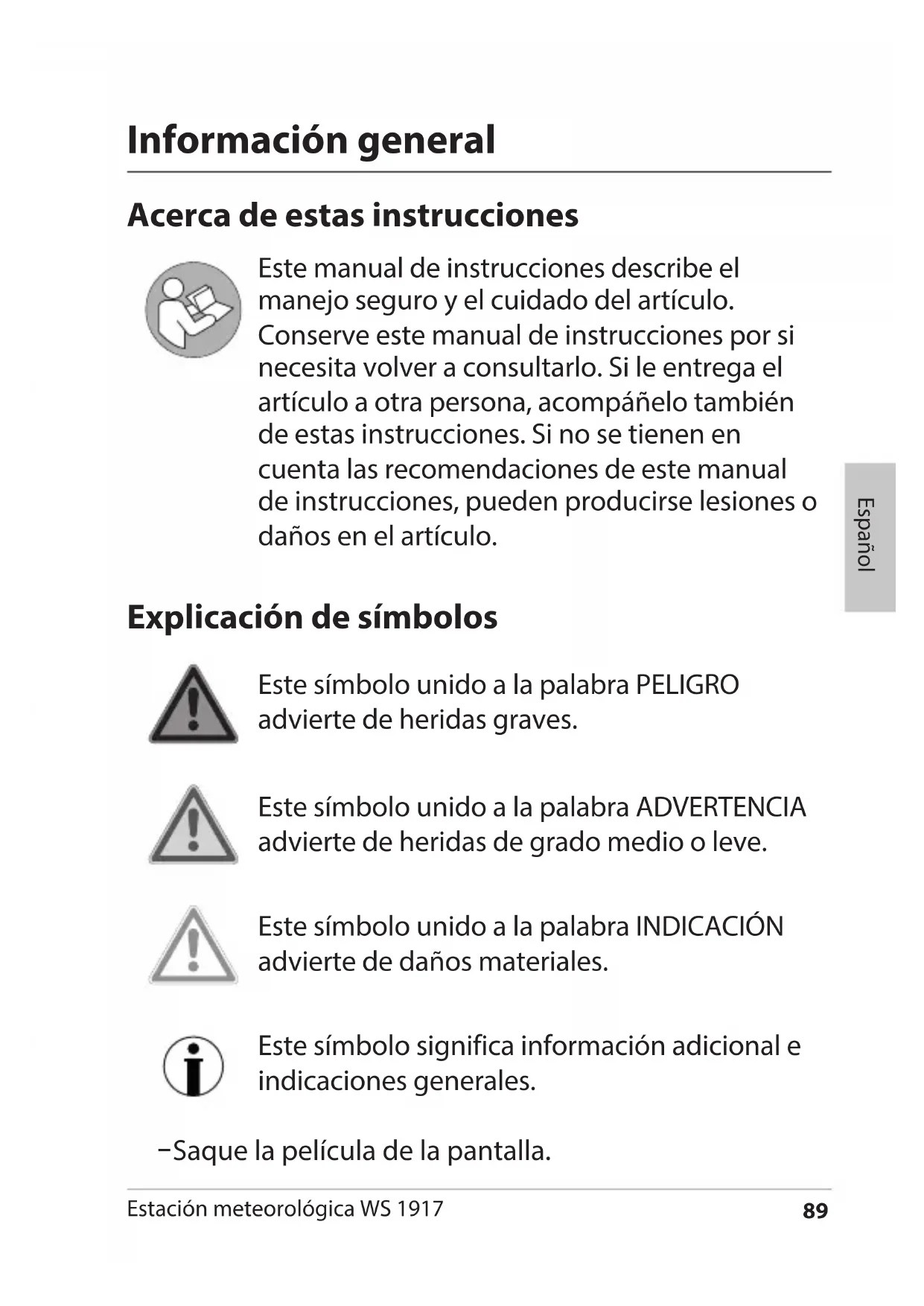 - Eliminación 9 Estación meteorológica WS 1917 Español Información general Acerca de estas instrucciones Este manual de instrucciones describe el manejo seguro y el cuidado del artículo. Conserve este manual de instrucciones por si necesita volver a consultarlo. Si le entrega el artículo a otra persona, acompáñelo también de estas instrucciones. Si no se tienen en cuenta las recomendaciones de este manual de instrucciones, pueden producirse lesiones o daños en el artículo. Explicación de símbolos Este símbolo unido a la palabra PELIGRO advierte de heridas graves. Este símbolo unido a la palabra ADVERTENCIA advierte de heridas de grado medio o leve. Este símbolo unido a la palabra INDICACIÓN advierte de daños materiales. Este símbolo significa información adicional e indicaciones generales. − Saque la película de la pantalla.90 Estación meteorológica WS 1917 Seguridad Este aparato puede ser utilizado por niños mayores de 8 años y por personas con discapacidad física, sensorial o mental o con falta de experiencia o conocimientos, siempre que estén supervisados o se les instruya sobre el uso seguro del aparato y hayan comprendido los riesgos que pueden producirse. El equipo y el adaptador de red deben mantenerse alejados de los niños menores de 8 años. La limpieza y mantenimiento por parte del usuario no deben ser realizados por niños, salvo que sean mayores de 8 años y estén supervisados. Las pilas pueden resultar peligrosas. Por lo tanto, mantenga las pilas fuera del alcance de los niños. En caso de ingestión o introducción de las pilas en el cuerpo de cualquier otro modo, se debe buscar ayuda médica de inmediato. De lo contrario, en el plazo de 2horas pueden producirse graves quemaduras químicas internas que podrían provocar la muerte. Debe vigilar que los niños no jueguen con el equipo. La estación meteorológica inalámbrica y el adaptador de red no deben sumergirse en agua ni en ningún otro líquido. ¡Riesgo de descarga eléctrica! Por tanto no utilice la base de la estación meteorológica inalámbrica cerca de fuentes de humedad como por ejemplo lavabos.91 Estación meteorológica WS 1917 Español Utilice únicamente el adaptador de red suministrado y sustitúyalo por otro del mismo tipo. El adaptador de red solo debe utilizarse en espacios interiores secos y debe protegerse contra la humedad. Riesgos para los niños Mantenga la los niños alejados del material de embalaje y de las piezas pequeñas contenidas en el material suministrado. Existe riesgo de asxia por ingestión. Riesgos debidos a la electricidad Conecte el dispositivo a un enchufe correctamente instalado con la tensión especicada en los "Datos técnicos". Preste atención a que el enchufe sea accesible para que, en caso necesario, pueda tirar rápidamente del adaptador de red. No utilice la estación meteorológica inalámbrica si el adaptador de red o su cable están dañados. No cubra el adaptador de red con cortinas, periódicos, etc, y procure que tenga suciente ventilación. El adaptador de red puede calentarse. Desenrolle totalmente el cable del adaptador de red antes de conectarlo. Al hacerlo, preste atención a que el cable no resulte dañado por bordes alados u objetos calientes.92 Estación meteorológica WS 1917 Saque el adaptador de red del enchufe: − antes de limpiar la estación meteorológica inalámbrica, − si claramente se produce un fallo durante su funcionamiento, durante una tormenta. − Tire siempre del adaptador, nunca del cable. No realice ninguna modicación en el artículo o en el cable de conexión. Realice las reparaciones únicamente en un taller especializado, ya que los aparatos no reparados por personal especializado representan un peligro para el usuario. No cambie el cable del adaptador de red. En caso de estar dañado el cable o el adaptador de red, debe desecharse y sustituirlo por uno del mismo tipo. Riesgo de lesiones Atención: existe riesgo de explosión debido a la incorrecta manipulación de las pilas. Las pilas no deben cargarse, reactivarse con otros medios, desmontarse, arrojarse al fuego o cortocircuitarse. Evite el contacto del líquido de las pilas con la piel, ojos y mucosas. En caso de contacto, debe limpiarse inmediatamente la zona afectada con agua limpia y acudir al médico sin pérdida de tiempo. Advertencia de daños materiales Proteja la base y el sensor exterior del polvo, los golpes, las temperaturas extremas y la exposición directa al sol. Proteja la estación base de la humedad. Coloque la base exclusivamente en un espacio cerrado y seco.93 Estación meteorológica WS 1917 Español El sensor exterior está protegido contra la humedad, pero debe evitarse que se moje directamente, como por ejemplo por la lluvia. Saque las pilas de la base y del sensor exterior cuando estén gastadas o cuando no vaya a utilizar la estación meteorológica durante mucho tiempo. De este modo evitará los daños que pudieran producirse por una fuga del líquido de las pilas. No exponga las pilas a condiciones extremas, poniéndolas por ejemplo sobre radiadores o expuestas directamente al sol. ¡Riesgo elevado de fugas! Cuando sea necesario, limpie los contactos del aparato y de las pilas antes de colocarlas. Cambie siempre todas las pilas de la estación base o del sensor exterior a la vez. Coloque únicamente pilas del mismo tipo y no utilice juntas pilas de tipos diferentes o pilas usadas junto con otras nuevas. No realice ninguna modicación en el aparato. Realice las reparaciones únicamente en un taller especializado y tenga en cuenta las condiciones de la garantía. No utilice nunca productos o medios de limpieza duros, ásperos o abrasivos para limpiar la estación meteorológica. Podría arañar las supercies.94 Estación meteorológica WS 1917 Uso adecuado La estación meteorológica, compuesta por estación base y sensor exterior inalámbrico, muestra diferentes datos meteorológicos del entorno próximo. A partir de los d