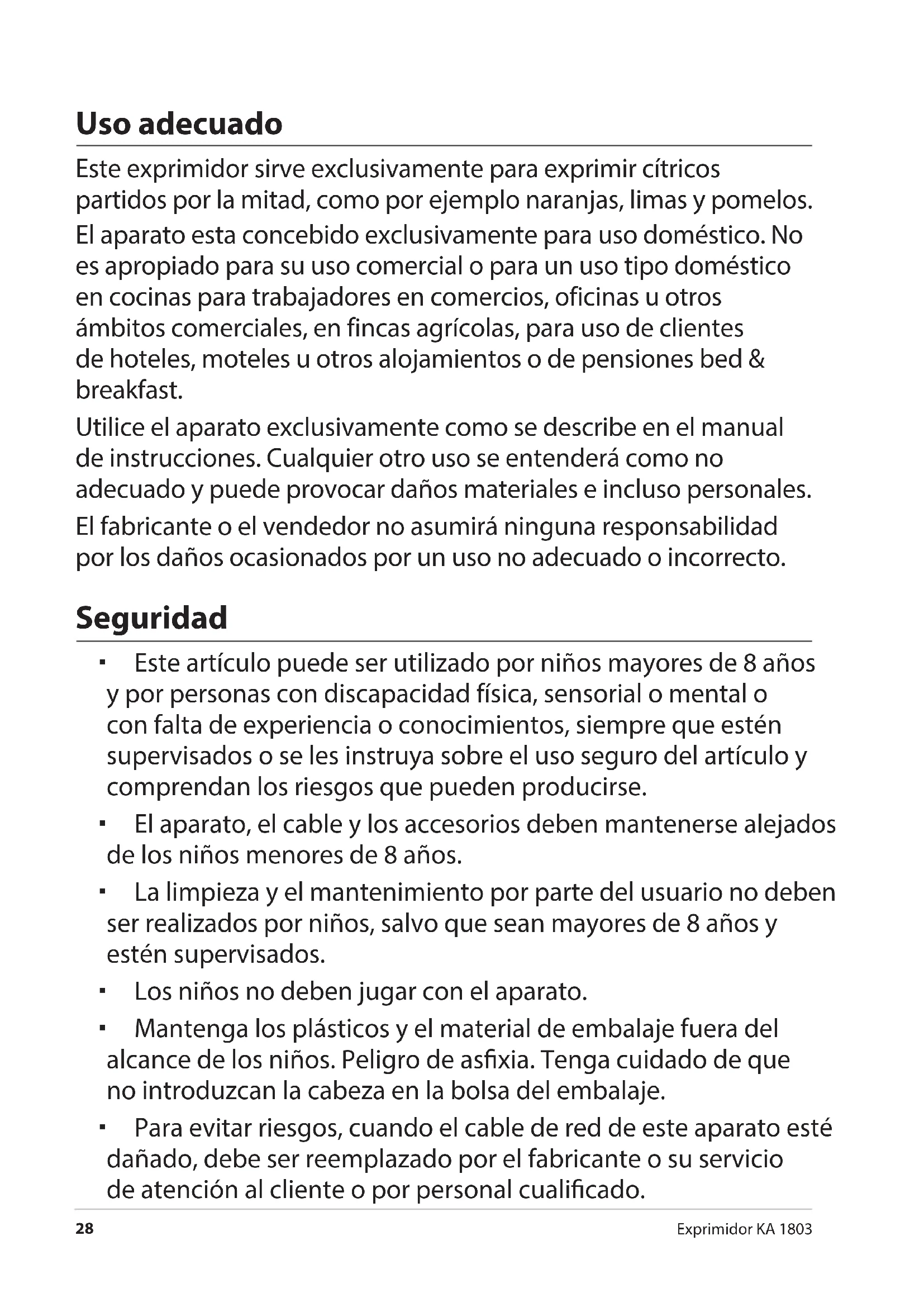 Este exprimidor sirve exclusivamente para exprimir citricos partidos por la mitad, como por exemple naranjas, limas y pomelos. El aparato esta concebido exclusivamente para uso dométrico. No es apropiado para su uso comercial o para un uso tipo dométrico en cocinas para trabajoores en commercios, ofecinas u otros ambitos commerciales, en fincas agrícolas, para uso de clientes de hoteles, moteles uthers alojamenti o de pensiones bed & breakfast.