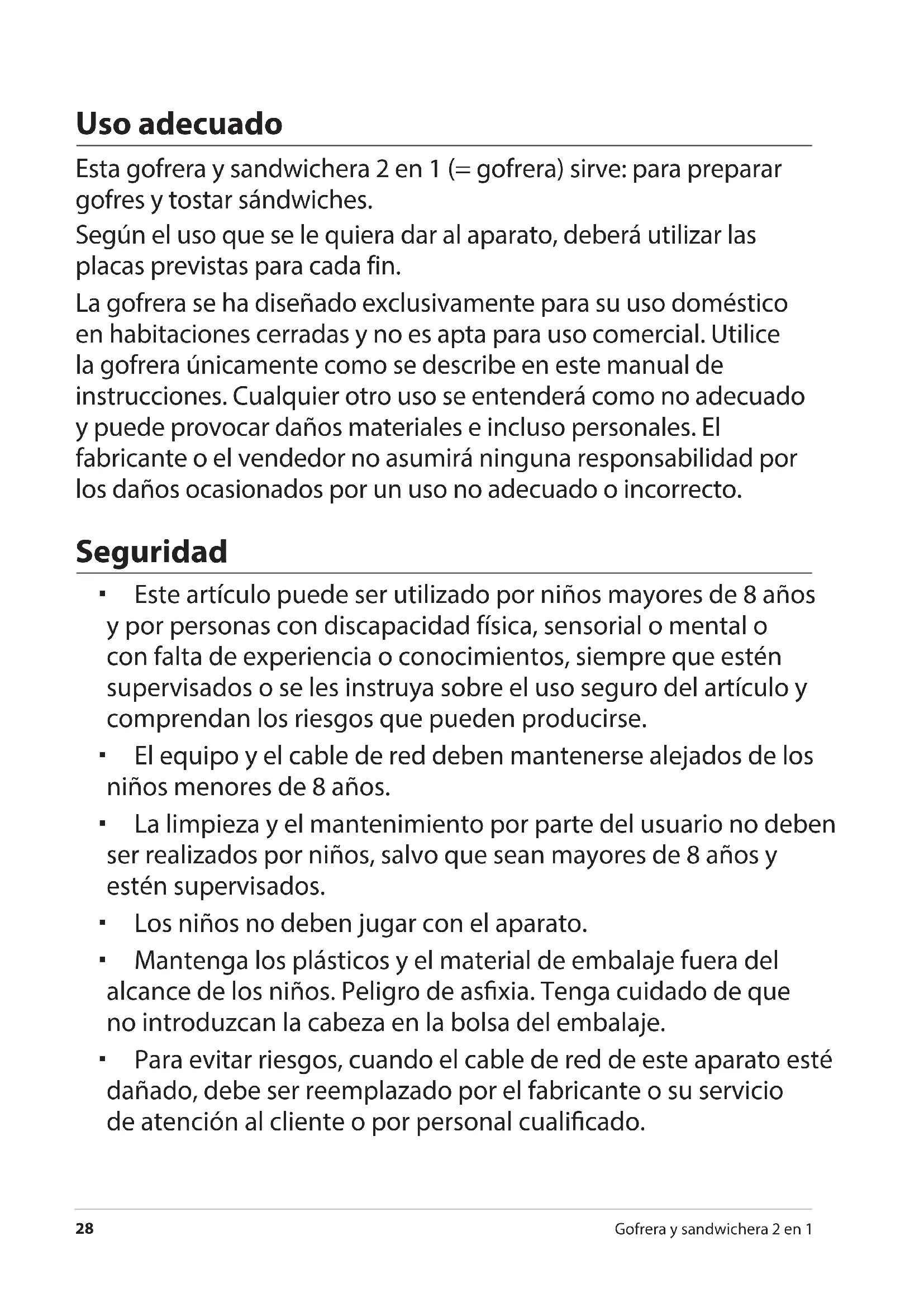 Gofrera y sandwichera 2 en 1 Uso adecuado Esta gofrera y sandwichera 2 en 1 (= gofrera) sirve: para preparar gofres y tostar sándwiches. Según el uso que se le quiera dar al aparato, deberá utilizar las placas previstas para cada fin. La gofrera se ha diseñado exclusivamente para su uso doméstico en habitaciones cerradas y no es apta para uso comercial. Utilice la gofrera únicamente como se describe en este manual de instrucciones. Cualquier otro uso se entenderá como no adecuado y puede provocar daños materiales e incluso personales. El fabricante o el vendedor no asumirá ninguna responsabilidad por los daños ocasionados por un uso no adecuado o incorrecto. Seguridad Este artículo puede ser utilizado por niños mayores de 8 años y por personas con discapacidad física, sensorial o mental o con falta de experiencia o conocimientos, siempre que estén supervisados o se les instruya sobre el uso seguro del artículo y comprendan los riesgos que pueden producirse. El equipo y el cable de red deben mantenerse alejados de los niños menores de 8 años. La limpieza y el mantenimiento por parte del usuario no deben ser realizados por niños, salvo que sean mayores de 8años y estén supervisados. Los niños no deben jugar con el aparato. Mantenga los plásticos y el material de embalaje fuera del alcance de los niños. Peligro de asxia. Tenga cuidado de que no introduzcan la cabeza en la bolsa del embalaje. Para evitar riesgos, cuando el cable de red de este aparato esté dañado, debe ser reemplazado por el fabricante o su servicio de atención al cliente o por personal cualicado.Seguridad