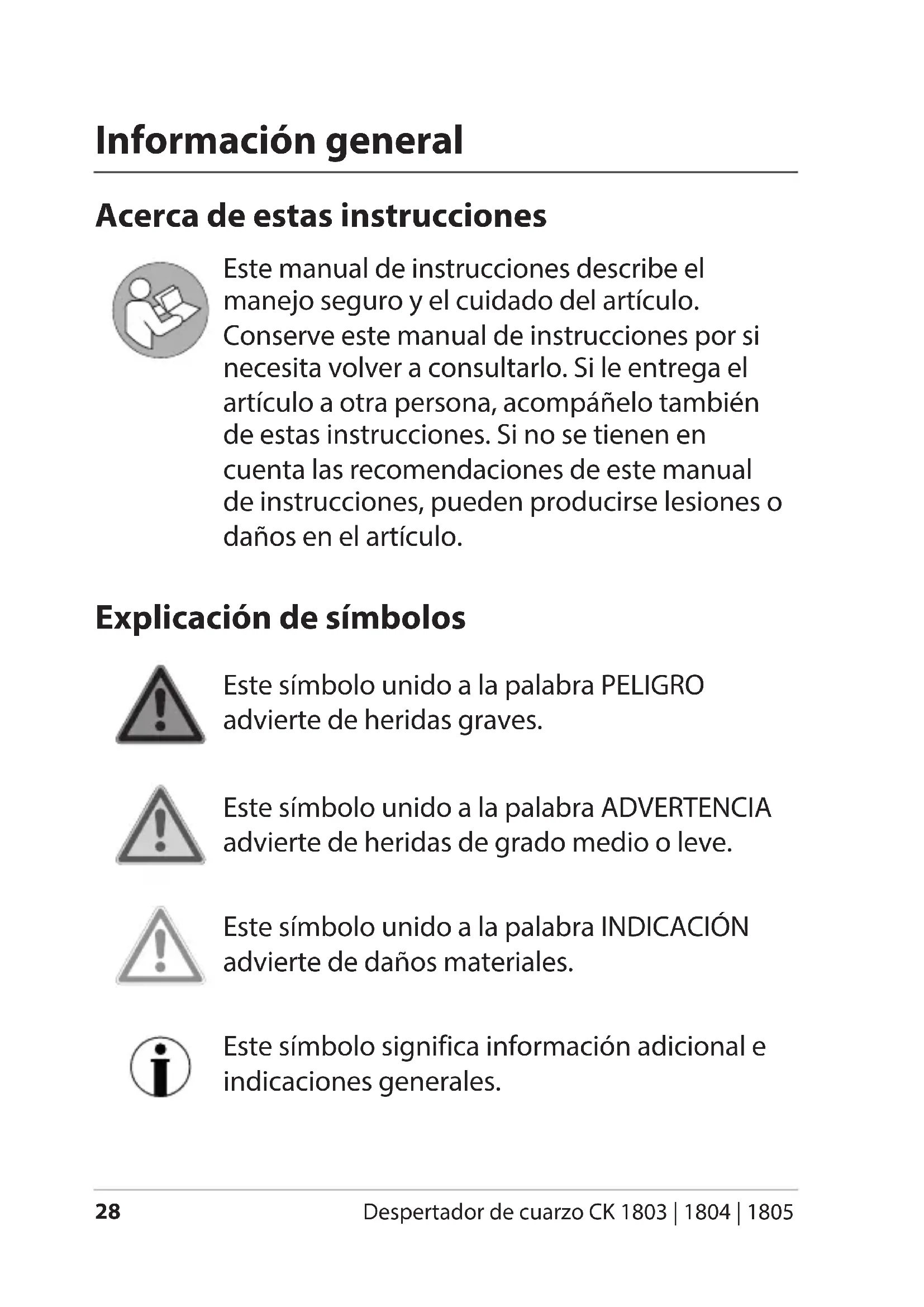 - Eliminación Despertador de cuarzo CK 1803 | 1804 | 1805 Información general Acerca de estas instrucciones Este manual de instrucciones describe el manejo seguro y el cuidado del artículo. Conserve este manual de instrucciones por si necesita volver a consultarlo. Si le entrega el artículo a otra persona, acompáñelo también de estas instrucciones. Si no se tienen en cuenta las recomendaciones de este manual de instrucciones, pueden producirse lesiones o daños en el artículo. Explicación de símbolos Este símbolo unido a la palabra PELIGRO advierte de heridas graves. Este símbolo unido a la palabra ADVERTENCIA advierte de heridas de grado medio o leve. Este símbolo unido a la palabra INDICACIÓN advierte de daños materiales. Este símbolo significa información adicional e indicaciones generales.29 Despertador de cuarzo CK 1803 | 1804 | 1805 Español Uso adecuado Este despertador está concebido para el uso particular en un espacio interior seco. Seguridad Este artículo puede ser utilizado por niños mayores de 8 años y por personas con discapacidad física, sensorial o mental o con falta de experiencia o conocimientos, siempre que estén supervisados o se les instruya sobre el uso seguro del artículo y comprendan los riesgos que pueden producirse. Los niños no deben jugar con el artículo. La limpieza y el mantenimiento por parte del usuario no deben ser realizados por niños, salvo que sean mayores de 8 años y estén supervisados. Las pilas pueden suponer un peligro de muerte si se ingieren. Mantenga el artículo y las pilas fuera del alcance de los niños. En caso de ingerirse una pila, debe acudirse inmediatamente en busca de asistencia médica.30 Despertador de cuarzo CK 1803 | 1804 | 1805 RIESGOS para los niños Mantenga a los niños lejos del material de embalaje. Existe riesgo de asxia por ingestión. RIESGO de incendio/combustión y/o explosión Peligro de explosión debido a una sustitución incorrecta de las pilas. Cambie las pilas únicamente por otras iguales o del mismo tipo. Tenga en cuenta los "Datos técnicos". Las pilas no deben cargarse, reactivarse con otros medios, desmontarse, arrojarse al fuego o cortocircuitarse. En caso contrario, existe un riesgo mayor de explosión y fuga y además pueden producirse gases. Evite el contacto del líquido de las pilas con la piel, ojos y mucosas. En caso de contacto, limpie inmediatamente la zona afectada con agua limpia y acuda al médico sin pérdida de tiempo. ADVERTENCIA ante posibles daños materiales Proteja el despertador de golpes fuertes, sacudidas y de la humedad. Retire las pilas del artículo si están gastadas o si no se va a usar el despertador durante un largo periodo de tiempo. De este modo, se evitan daños que podrían producirse por posibles fugas. Cuando coloque y cambie las pilas, preste atención a la polaridad correcta (+/-).31 Despertador de cuarzo CK 1803 | 1804 | 1805 Español No someta las pilas a condiciones extremas, por ejemplo, no las coloque sobre supercies calientes ni a la luz directa del sol. ¡Riesgo elevado de fugas! Cuando sea necesario, limpie los contactos del aparato y de las pilas antes de colocarlas. Utilice exclusivamente pilas del mismo tipo. No lleve a cabo ninguna modicación en el artículo. Realice las reparaciones únicamente en un taller especializado. Las reparaciones realizadas de forma inadecuada pueden suponer un riesgo elevado para el usuario. Datos técnicos Modelo: Despertador de cuarzo CK1803 (rosa), CK1804 (azul), CK1805 (azul claro) Batería: 2x R6 (AA), 1,5 V Intensidad de corriente: 220 mA Distribuidor: Waagen-Schmitt GmbH Hammer Steindamm 27-29 22089 Hamburgo, Alemania Nuestros productos se están desarrollando y mejorando continuamente. Por este motivo, cabe la posibilidad de que en cualquier momento pudiera haber cambios en el diseño o modificaciones técnicas.32 Despertador de cuarzo CK 1803 | 1804 | 1805 De un vistazo p. 3628