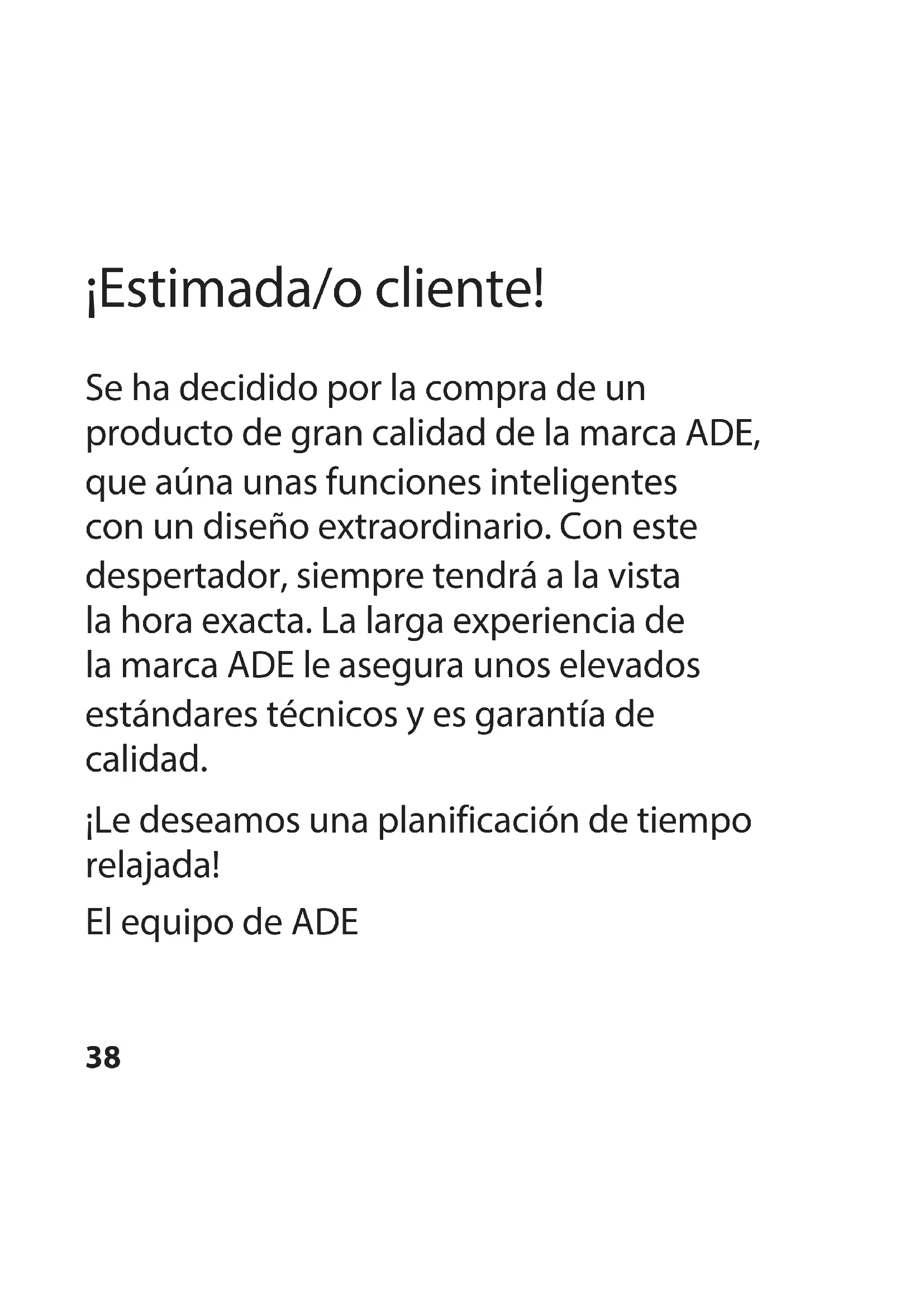 El artículo debe ser eliminado de forma adecuada al final de su vida útil. Para ello, se deben reciclar las piezas del aparato y así evitar un daño al medio ambiente. Deposite el aparato antiguo en un punto de recogida de restos electrónicos o desechos reciclables. Para más información, diríjase a su empresa de recogida de residuos o administración local. Las pilas y baterías no son residuos domésticos Todas las pilas y baterías deben depositarse en los puntos de recogida del ayuntamiento, del distrito o en los comercios. De este modo, puede realizarse la eliminación de pilas y baterías de una forma respetuosa con el medio ambiente.56 Chère cliente, cher client! Nous sommes ravis que vous ayez choisi un appareil de haute qualité de la marque ADE, qui allie des fonctions intelligentes à un design exceptionnel. Ce réveil vous permettra d'être toujours à l'heure. Les années d'expérience de la marque ADE garantissent une haute technicité et une qualité éprouvée. Nous vous souhaitons d’agréables moments en toute ponctualité! L’équipe ADE57
