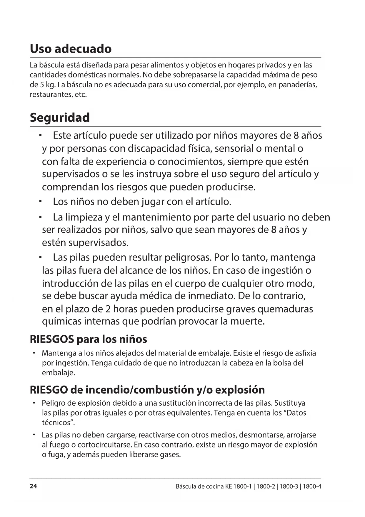 Báscula de cocina KE 1800-1 | 1800-2 | 1800-3 | 1800-4 Uso adecuado La báscula está diseñada para pesar alimentos y objetos en hogares privados y en las cantidades domésticas normales. No debe sobrepasarse la capacidad máxima de peso de 5 kg. La báscula no es adecuada para su uso comercial, por ejemplo, en panaderías, restaurantes, etc. Seguridad Este artículo puede ser utilizado por niños mayores de 8 años y por personas con discapacidad física, sensorial o mental o con falta de experiencia o conocimientos, siempre que estén supervisados o se les instruya sobre el uso seguro del artículo y comprendan los riesgos que pueden producirse. Los niños no deben jugar con el artículo. La limpieza y el mantenimiento por parte del usuario no deben ser realizados por niños, salvo que sean mayores de 8 años y estén supervisados. Las pilas pueden resultar peligrosas. Por lo tanto, mantenga las pilas fuera del alcance de los niños. En caso de ingestión o introducción de las pilas en el cuerpo de cualquier otro modo, se debe buscar ayuda médica de inmediato. De lo contrario, en el plazo de 2 horas pueden producirse graves quemaduras químicas internas que podrían provocar la muerte. RIESGOS para los niños Mantenga a los niños alejados del material de embalaje. Existe el riesgo de asxia por ingestión. Tenga cuidado de que no introduzcan la cabeza en la bolsa del embalaje. RIESGO de incendio/combustión y/o explosión Peligro de explosión debido a una sustitución incorrecta de las pilas. Sustituya las pilas por otras iguales o por otras equivalentes. Tenga en cuenta los “Datos técnicos”. Las pilas no deben cargarse, reactivarse con otros medios, desmontarse, arrojarse al fuego o cortocircuitarse. En caso contrario, existe un riesgo mayor de explosión o fuga, y además pueden liberarse gases.Seguridad