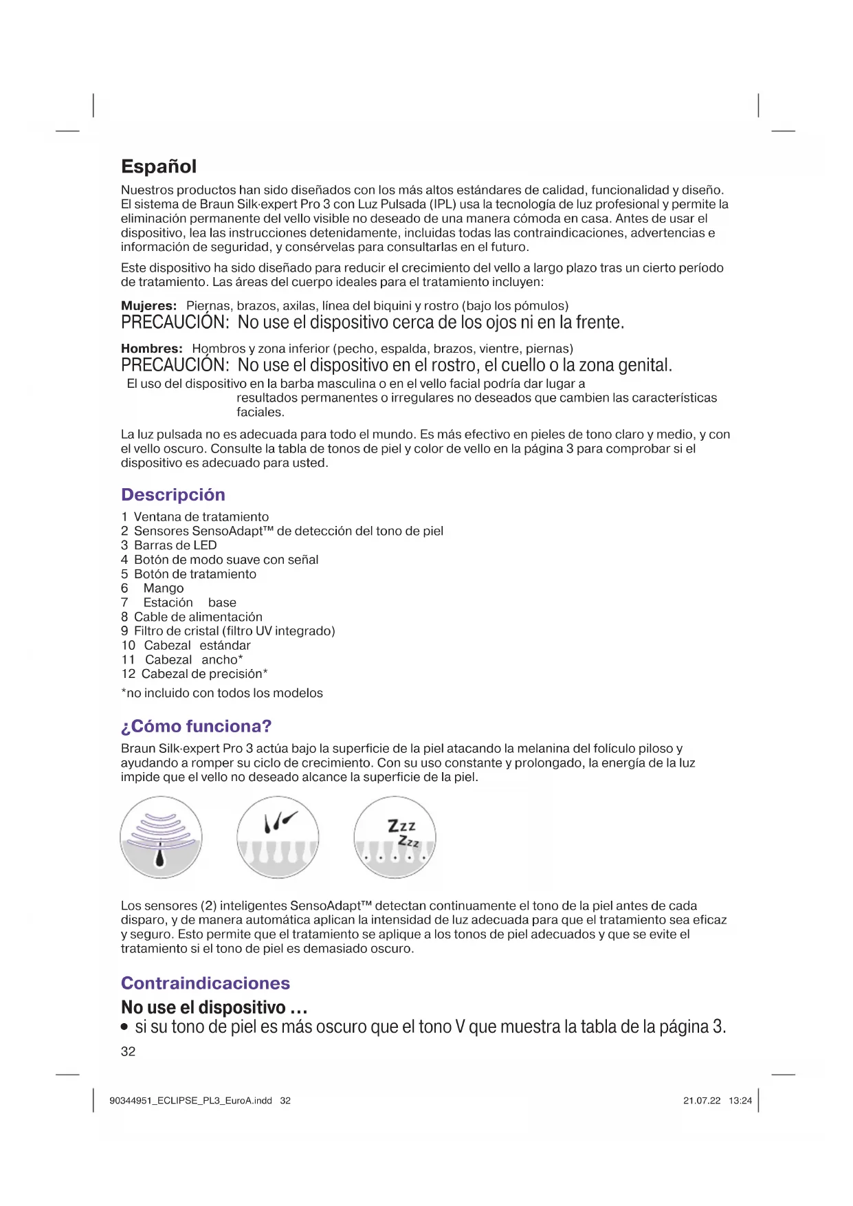si su tono de piel es más oscuro que el tono V que muestra la tabla de la página 3. 90344951_ECLIPSE_PL3_EuroA.indd 3290344951_ECLIPSE_PL3_EuroA.indd 32 21.07.22 13:2421.07.22 13:2433 Puesto que la piel oscura absorbe más energía luminosa, el tratamiento en la piel muy oscura podría causar molestias/dolor y efectos adversos (p. ej. quemaduras, ampollas, decoloración o cicatrices) y dañar la piel;