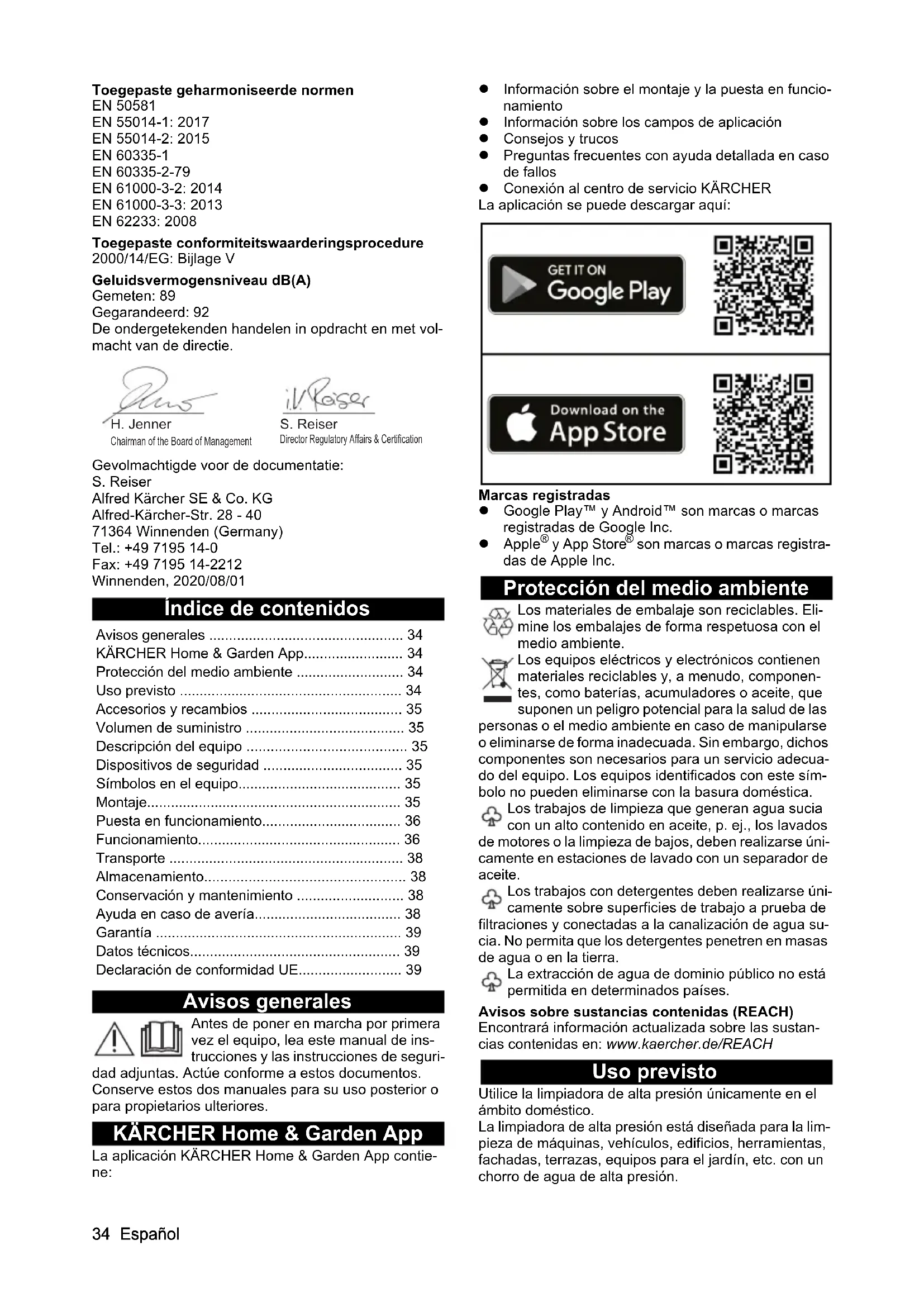 dB(A) 92 9234 Español Toegepaste geharmoniseerde normen EN 50581 EN 55014-1: 2017 EN 55014-2: 2015 EN 60335-1 EN 60335-2-79 EN 61000-3-2: 2014 EN 61000-3-3: 2013 EN 62233: 2008 Toegepaste conformiteitswaarderingsprocedure 2000/14/EG: Bijlage V Geluidsvermogensniveau dB(A) Gemeten: 89 Gegarandeerd: 92 De ondergetekenden handelen in opdracht en met vol- macht van de directie. Gevolmachtigde voor de documentatie: S. Reiser Alfred Kärcher SE & Co. KG Alfred-Kärcher-Str. 28 - 40 71364 Winnenden (Germany) Tel.: +49 7195 14-0 Fax: +49 7195 14-2212 Winnenden, 2020/08/01 Índice de contenidos Avisos generales Antes de poner en marcha por primera vez el equipo, lea este manual de ins- trucciones y las instrucciones de seguri- dad adjuntas. Actúe conforme a estos documentos. Conserve estos dos manuales para su uso posterior o para propietarios ulteriores. KÄRCHER Home & Garden App La aplicación KÄRCHER Home & Garden App contie- ne: Información sobre el montaje y la puesta en funcio- namiento Información sobre los campos de aplicación Consejos y trucos Preguntas frecuentes con ayuda detallada en caso de fallos Conexión al centro de servicio KÄRCHER La aplicación se puede descargar aquí: Marcas registradas Google Play™ y Android™ son marcas o marcas registradas de Google Inc. Apple