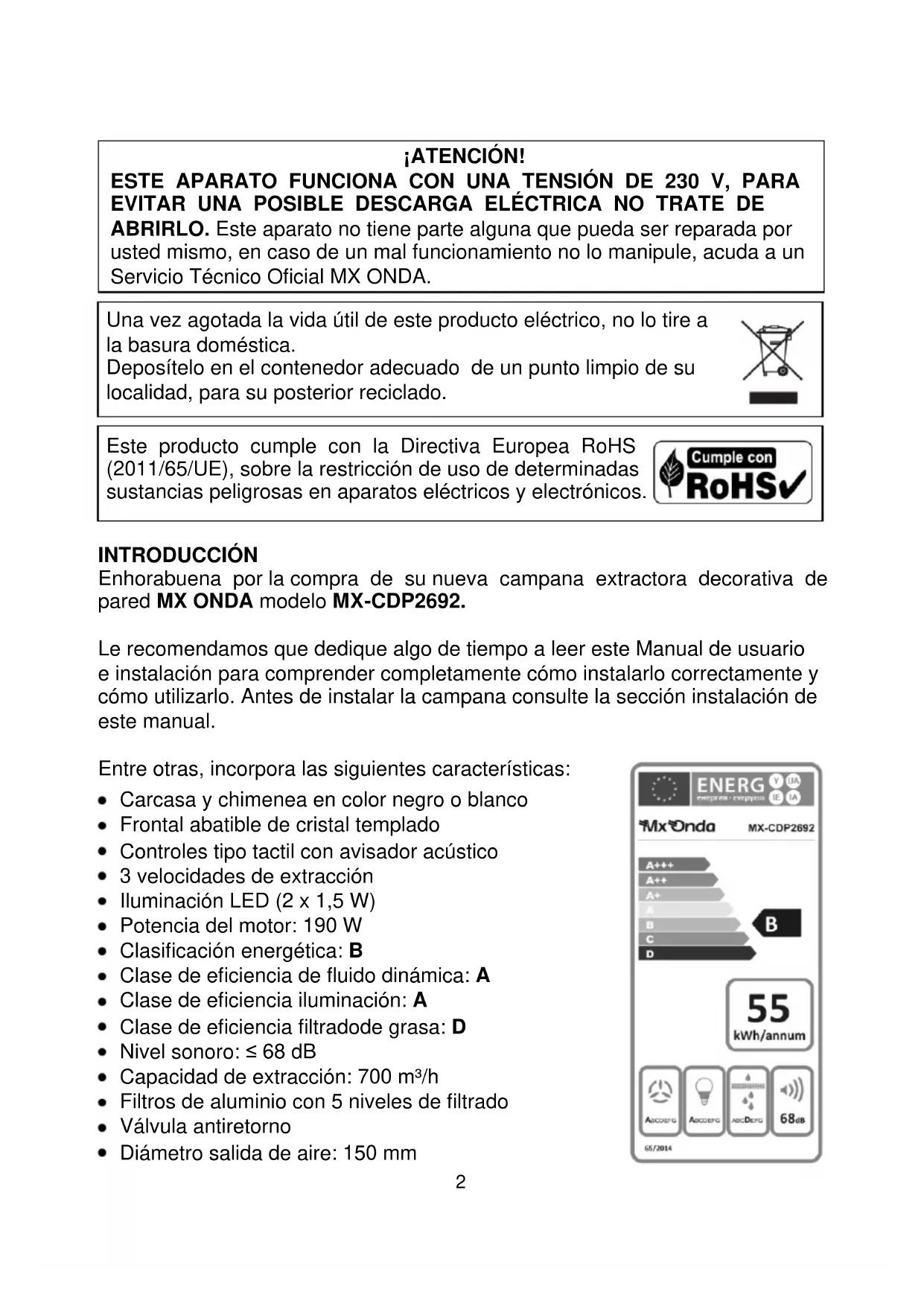 INTRODUCCIÓN Enhorabuena por la compra de su nueva campana extractora decorativa de pared MX ONDA modelo MX-CDP2692. Le recomendamos que dedique algo de tiempo a leer este Manual de usuario e instalación para comprender completamente cómo instalarlo correctamente y cómo utilizarlo. Antes de instalar la campana consulte la sección instalación de este manual. Entre otras, incorpora las siguientes características: Carcasa y chimenea en color negro o blanco Frontal abatible de cristal templado Controles tipo tactil con avisador acústico 3 velocidades de extracción Iluminación LED (2 x 1,5 W) Potencia del motor: 190 W Clasificación energética: B Clase de eficiencia de fluido dinámica: A Clase de eficiencia iluminación: A Clase de eficiencia filtradode grasa: D Nivel sonoro: ≤ 68 dB Capacidad de extracción: 700 m³/h Filtros de aluminio con 5 niveles de filtrado Válvula antiretorno Diámetro salida de aire: 150 mm Una vez agotada la vida útil de este producto eléctrico, no lo tire a la basura doméstica. Deposítelo en el contenedor adecuado de un punto limpio de su localidad, para su posterior reciclado. Este producto cumple con la Directiva Europea RoHS (2011/65/UE), sobre la restricción de uso de determinadas sustancias peligrosas en aparatos eléctricos y electrónicos.3