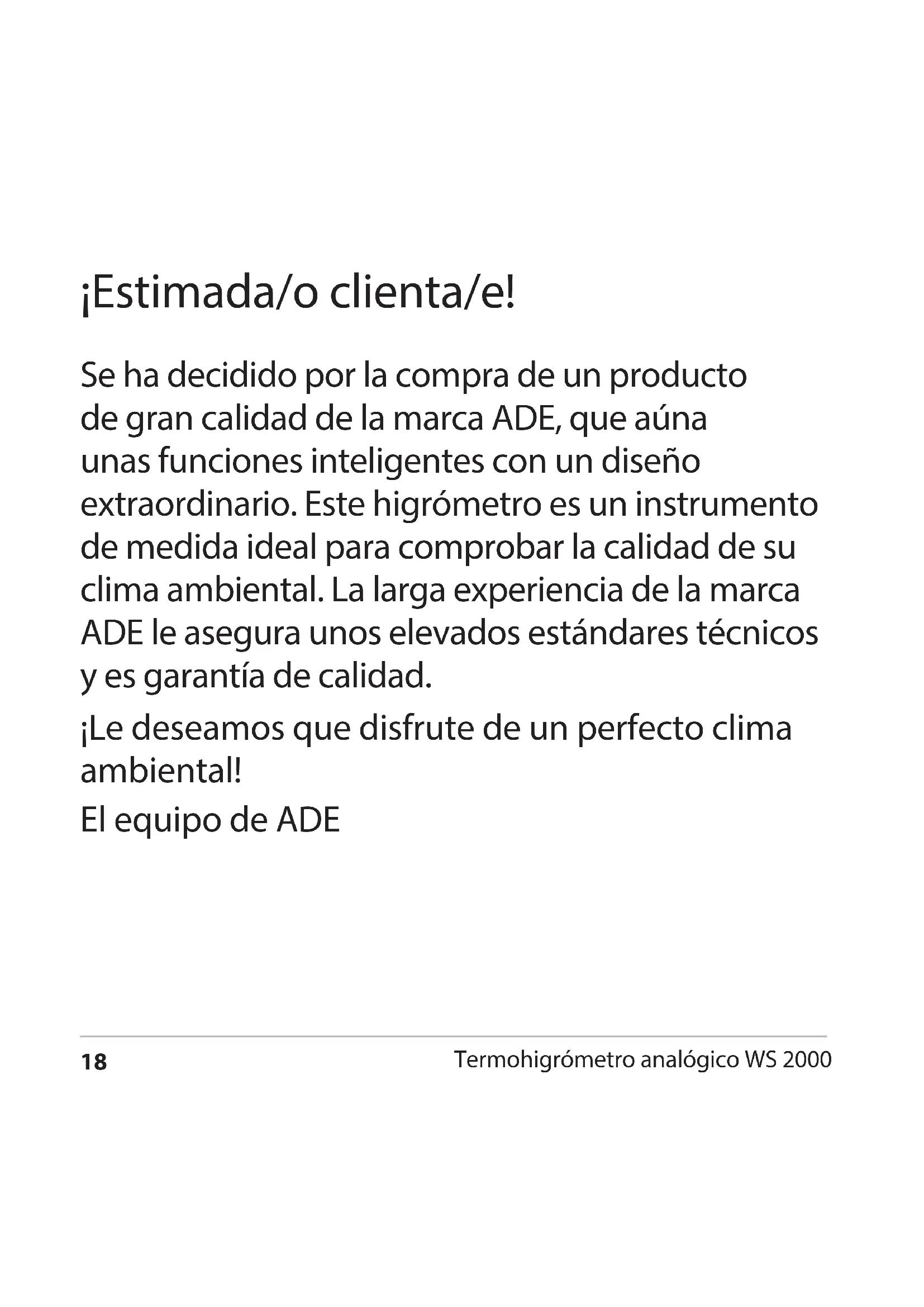 - 1 Hanging eyelet (back) 2 Temperature in degrees Celsius 3 Relative humidity expressed as a percentage 4 Foldable stand (back)15 Analogue thermometer/hygrometer WS 2000 English Setting up/hanging the device You can set up the thermometer/hygrometer using either the foldable stand or the hanging eyelet. If possible, choose a location where the thermometer/ hygrometer is not exposed to direct sunlight and where the air circulates well. Cleaning Remove dust from the thermometer/hygrometer with a soft, dry cloth, if necessary. If necessary, you can also wipe the device with a slightly damp cloth. Do not immerse the thermometer/hygrometer in water or other liquids. The device is not waterproof.16 Analogue thermometer/hygrometer WS 2000 Warranty The company Waagen-Schmitt GmbH warrants for 2 years from the purchase date the cost-free rectification of defects in material or workmanship through repair or exchange. In the event of a warranty claim, please return the product with the proof of purchase (specifying the reason for claim) to your dealer. Disposal Disposing of the packaging Dispose of the packaging with similar materials. Dispose of cardboard and carton as waste paper and of films to the collection point. Disposing of the product Dispose of the product in accordance with the regulations that apply in your country.17 Analogue thermometer/hygrometer WS 2000 English18 Termohigrómetro analógico WS 2000 ¡Estimada/o clienta/e! Se ha decidido por la compra de un producto de gran calidad de la marca ADE, que aúna unas funciones inteligentes con un diseño extraordinario. Este higrómetro es un instrumento de medida ideal para comprobar la calidad de su clima ambiental. La larga experiencia de la marca ADE le asegura unos elevados estándares técnicos y es garantía de calidad. ¡Le deseamos que disfrute de un perfecto clima ambiental! El equipo de ADE19 Termohigrómetro analógico WS 2000 Español Este manual de instrucciones describe el manejo seguro y el cuidado del artículo. Conserve este manual de instrucciones por si necesita volver a consultarlo. Si le entrega el artículo a otra persona, acompáñelo también de estas instrucciones. Si no se tienen en cuenta las recomendaciones de este manual de instrucciones, pueden producirse lesiones o daños en el artículo. Índice Uso adecuado p. 20