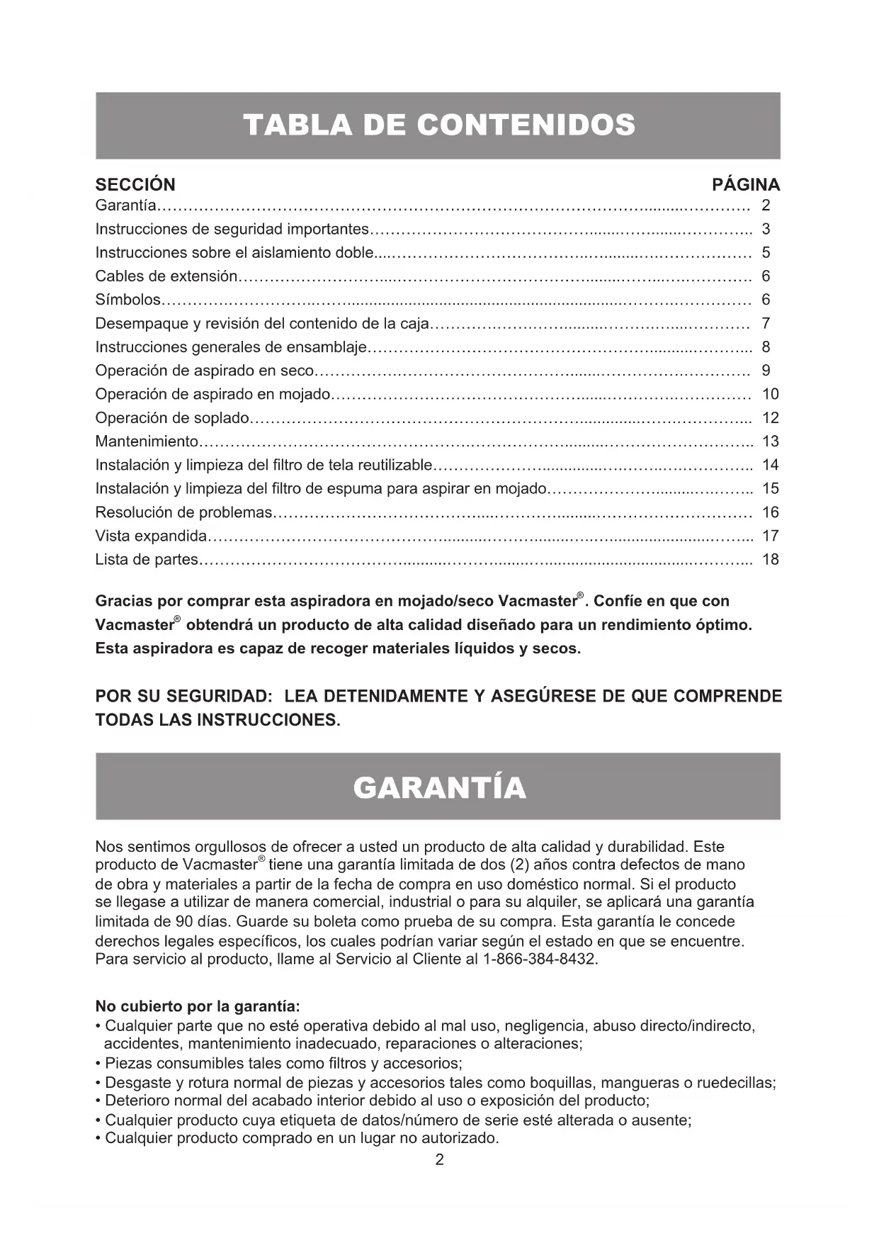 obtendrá un producto de alta calidad diseñado para un rendimiento óptimo. Esta aspiradora es capaz de recoger materiales líquidos y secos. POR SU SEGURIDAD: LEA DETENIDAMENTE Y ASEGÚRESE DE QUE COMPRENDE TODAS LAS INSTRUCCIONES. Nos sentimos orgullosos de ofrecer a usted un producto de alta calidad y durabilidad. Este producto de Vacmaster