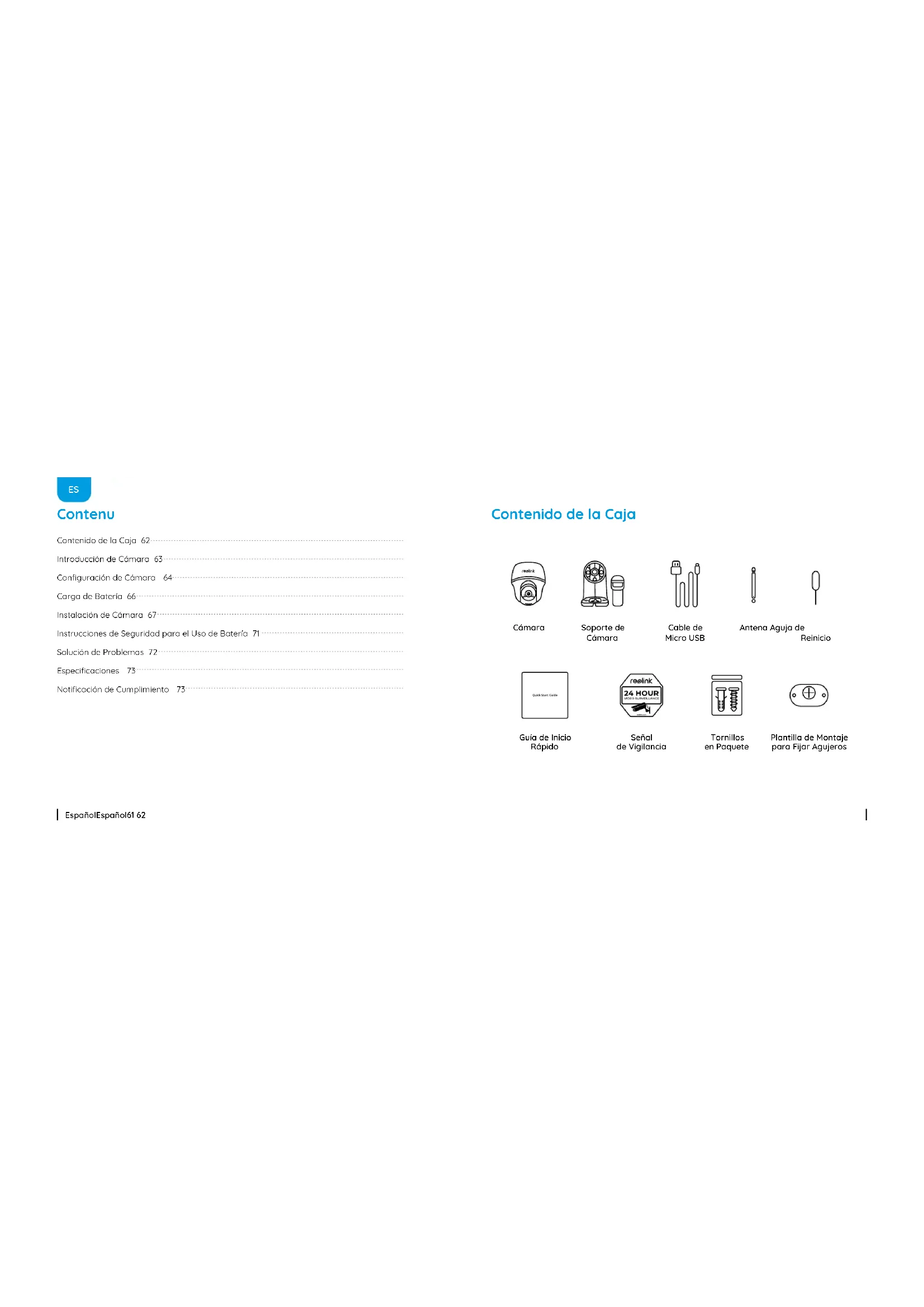 Contenu Contenido de la Caja 62 Introducción de Cámara 63 ConguracióndeCámara 64 Carga de Batería 66 Instalación de Cámara 67 Instrucciones de Seguridad para el Uso de Batería 71 Solución de Problemas 72 Especicaciones 73 NoticacióndeCumplimiento 73Español Español63 64 OFF OPEN