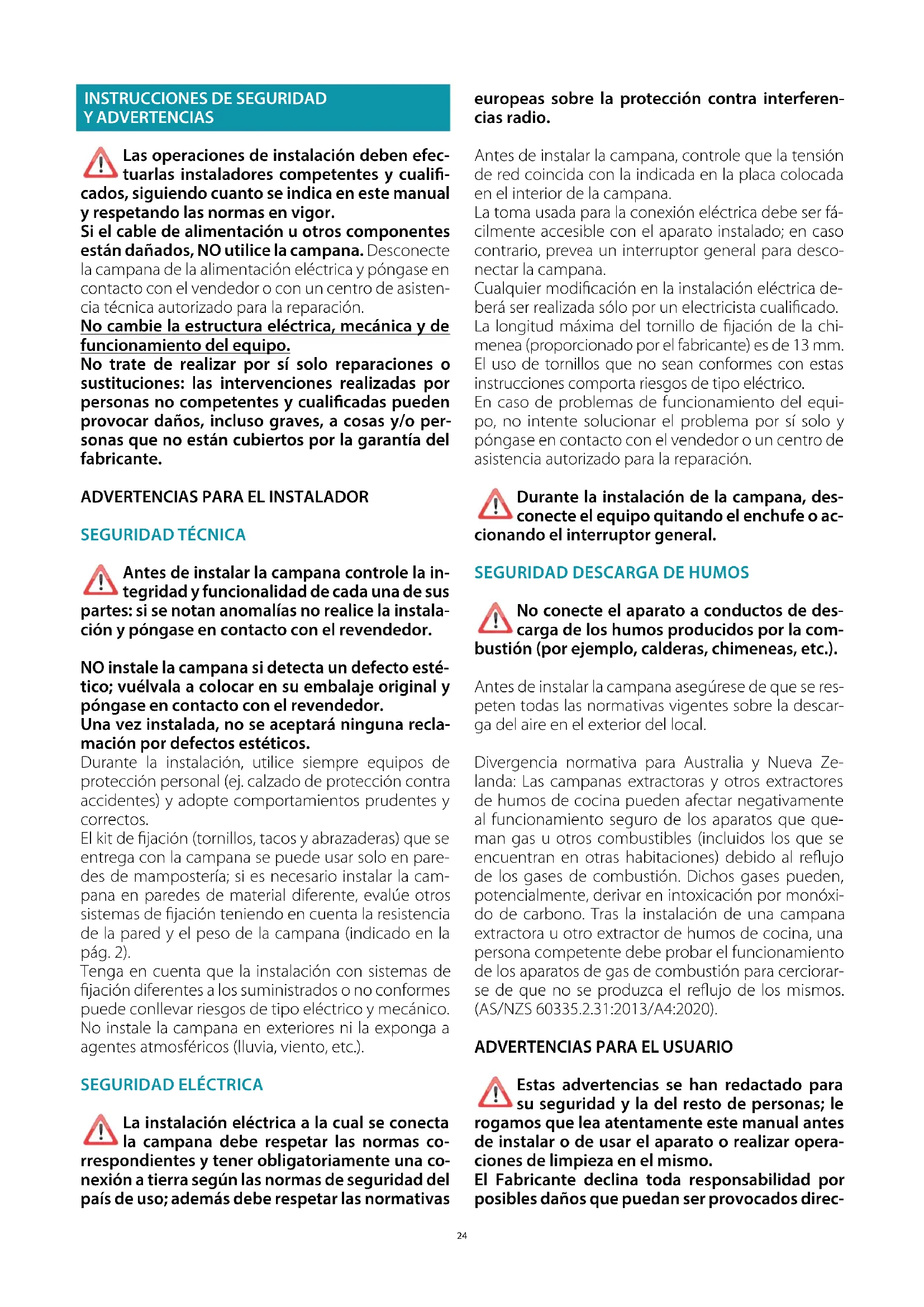 Antes de instalar la campana controle la in- tegridad y funcionalidad de cada una de sus partes: si se notan anomalías no realice la instala- ción y póngase en contacto con el revendedor. NO instale la campana si detecta un defecto esté- tico; vuélvala a colocar en su embalaje original y póngase en contacto con el revendedor. Una vez instalada, no se aceptará ninguna recla- mación por defectos estéticos. Durante la instalación, utilice siempre equipos de protección personal (ej. calzado de protección contra accidentes) y adopte comportamientos prudentes y correctos. El kit de fijación (tornillos, tacos y abrazaderas) que se entrega con la campana se puede usar solo en pare- des de mampostería; si es necesario instalar la cam- pana en paredes de material diferente, evalúe otros sistemas de fijación teniendo en cuenta la resistencia de la pared y el peso de la campana (indicado en la pág. 2). Tenga en cuenta que la instalación con sistemas de fijación diferentes a los suministrados o no conformes puede conllevar riesgos de tipo eléctrico y mecánico. No instale la campana en exteriores ni la exponga a agentes atmosféricos (lluvia, viento, etc.).