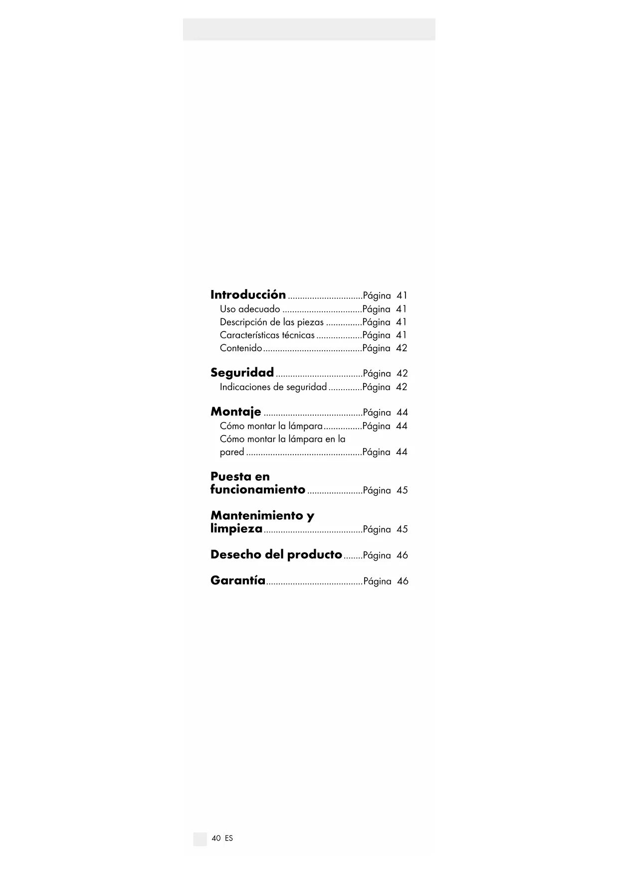 robku vyskytne vada materiálu nebo výrobní vada, výro bek Vám – dle našeho rozhodnutí –39 CZ bezplatně opravíme nebo vyměníme. Tato záruka zaniká, jestliže se výrobek poškodí, neodborně použil nebo neobdržel pravidelnou údržbu. Záruka platí na vady materiálu a výrobní vady. Tato záruka se nevztahuje na díly výrobku podlé- hající opotřebení (např. na baterie), dále na po- škození křehkých, choulostivých dílů, např. vypí- načů, akumulátorů nebo dílů zhotovených ze skla.40 ES Introducción ...............................Página 41 Uso adecuado .................................Página 41 Descripción de las piezas ...............Página 41 Características técnicas ...................Página 41 Contenido .........................................Página 42 Seguridad ....................................Página 42 Indicaciones de seguridad ..............Página 42 Montaje .........................................Página 44 Cómo montar la lámpara ................Página 44 Cómo montar la lámpara en la pared ................................................Página 44 Puesta en funcionamiento .......................Página 45 Mantenimiento y limpieza .........................................Página 45 Desecho del producto ........Página 46 Garantía ........................................ Página 4641 ES Lámpara LED flexible Introducción Enhorabuena por la adquisición de su nuevo producto. Ha optado por un producto de alta calidad. El manual de instrucciones forma parte de este producto. Contiene importantes indica- ciones sobre seguridad, uso y eliminación. Antes de usar el producto, familiarícese con todas las indicaciones de manejo y de seguridad. Utilice el producto únicamente como se describe a con- tinuación y para las aplicaciones indicadas. Ad- junte igualmente toda la documentación en caso de entregar el producto a terceros. Uso adecuado Esta lámpara solo es adecuada para su uso en interiores, en habitaciones secas y cerradas. Este producto no ha sido concebido para un uso co- mercial. Descripción de las piezas