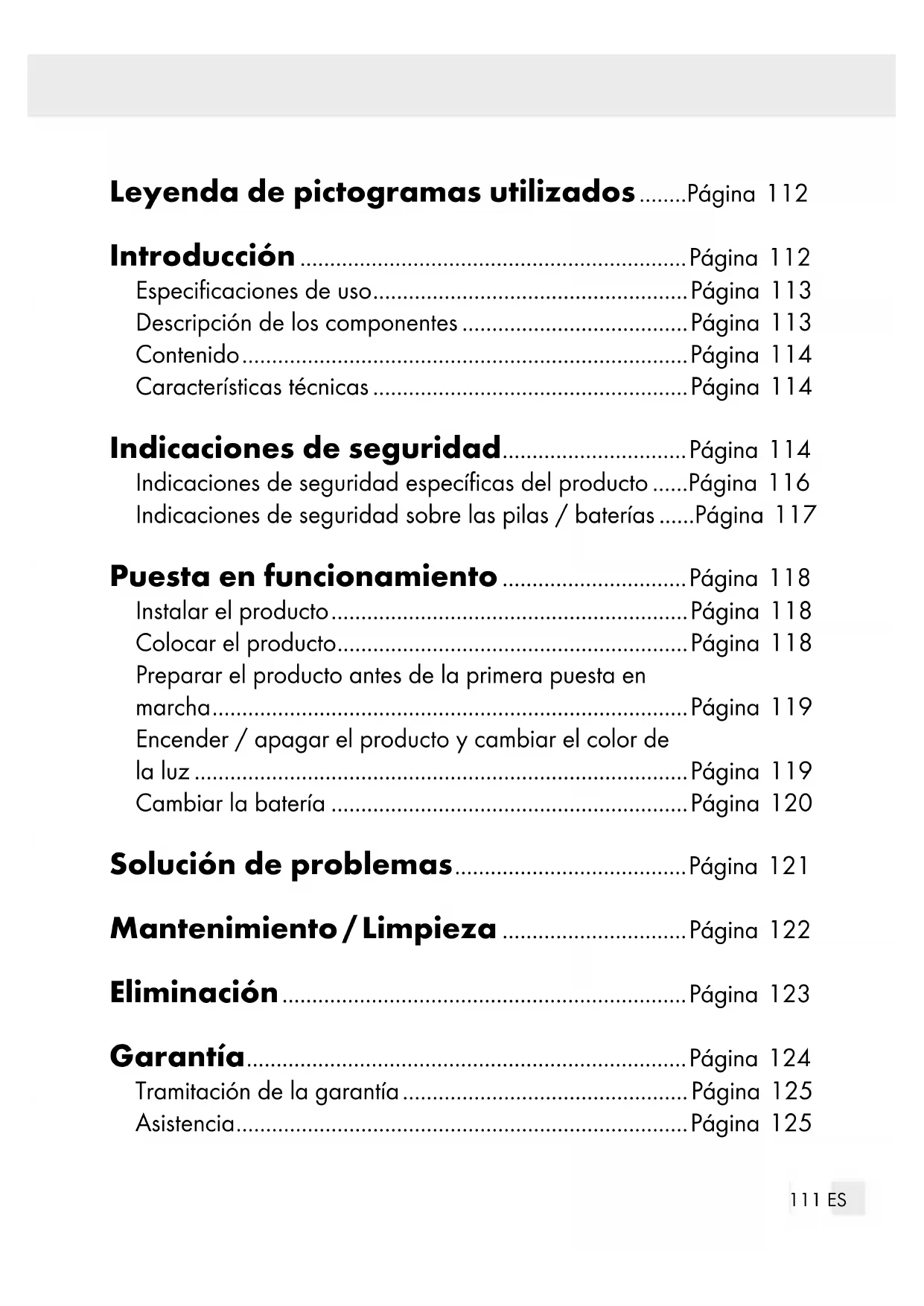ACCIDENTE PARA BEBÉS Y NIÑOS! Mantenga las baterías fuera del alcance de los niños. No deje las baterías sueltas en cualquier lugar. Existe el peligro de que los niños o algún animal doméstico las ingieran. En caso de ingesta, acuda inmediatamente a un médico. Los niños o las personas que carezcan de los conocimientos o la experiencia necesarios para manipular el producto, o aquellas cu- yas capacidades físicas, sensoriales o psicológicas estén limitadas, no deben utilizar el producto sin la supervisión o la instrucción de una persona responsable de su seguridad. Mantenga a los niños vigilados y no permita que jueguen con el producto. No permita que los niños jueguen con el material de embalaje sin la vigilancia de un adulto. Existe peligro de asfixia por el material de embalaje. Los niños no suelen ser conscientes de los peligros. Mantenga siempre el producto fuera del alcance de los niños. Este producto no es un juguete, por lo que debe mantenerse fuera del alcance de los niños. Los niños no son conscientes de los riesgos potenciales asociados al manejo de productos eléctricos. Nunca utilice el producto si detecta algún tipo de daño. Las bombillas LED no son reemplazables. Si las bombillas LED llegan al final de su vida útil, deberá reem- plazar todo el producto. ¡PELIGRO DE EXPLOSIÓN! No utilice el pro- ducto en entornos potencialmente explosivos, en los que pueda haber líquidos, gases o polvos inflamables.116 ES Indicaciones de seguridad específicas del producto No exponga el producto a vibraciones fuertes o grandes esfuerzos mecánicos. Asegúrese de que la pantalla de la lámpara no esté sucia ni cu- bierta de nieve y hielo en invierno. Esto disminuye la potencia del módulo solar