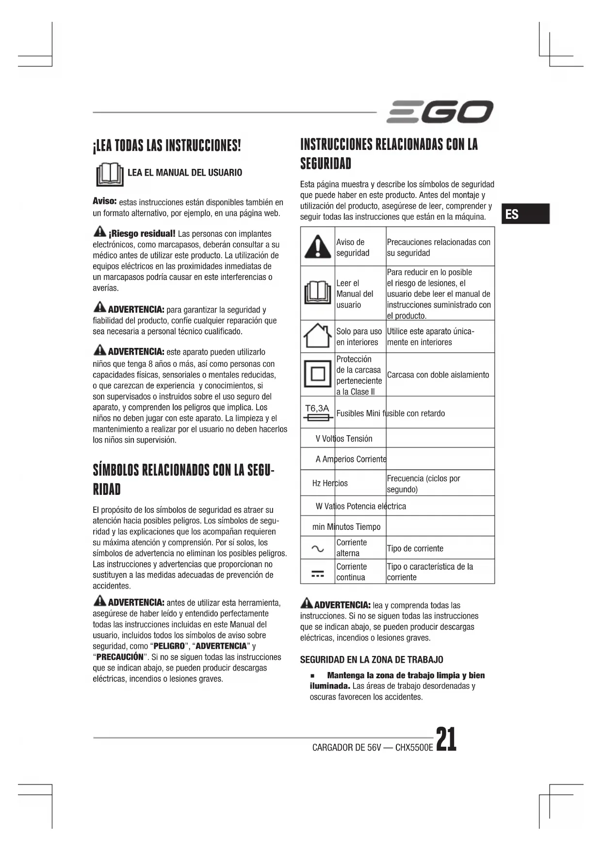 Descarga las instrucciones para tu Cargador de batería en formato PDF gratis! Encuentra tus instrucciones CHX5500 - EGO y toma tu dispositivo electrónico nuevamente en la mano. En esta página están publicados todos los documentos necesarios para el uso de su dispositivo. CHX5500 de la marca EGO.