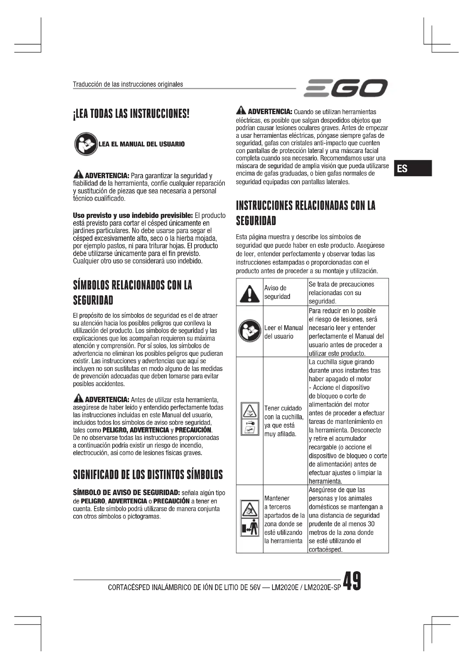 efectuarlas un técnico cualicado. ◾ i el interruptor de protección contra sobrecarga incorporado en el cortacésped se activa con frecuencia, póngase en contacto con el departamento de atención al cliente de EGO o el centro de servicio técnico de EGO más cercano. ◾ No limpie el cortacésped utilizando una manguera. Evite que penetre agua en el motor o en las conexiones eléctricas. ◾ Retire la llave de seguridad y almacene el cortacésped apagado en interiores cuando no esté en uso. Espere a que el motor se haya enfriado antes de guardarlo en algún espacio cerrado. El cortacésped deberá almacenarse en un lugar seco, elevado o cerrado con llave, fuera del alcance de niños. ◾ Al efectuar reparaciones, utilice únicamente recambios idénticos que se indican en este manual. La utilización de recambios que no cumplan las especicaciones de los equipos originales podría provocar un funcionamiento incorrecto y reducir la seguridad de la herramienta. ◾ Quite la batería o desconéctela antes de realizar trabajos de mantenimiento o limpieza, o de retirar material del cortacésped. ◾ Siga las instrucciones para cambiar accesorios. ◾ Mantenga las empuñaduras de la herramienta secas, limpias y libres de aceite y grasa. ◾ Para reducir el riesgo de incendio, mantenga la tapa del motor libre de hierba, hojas y suciedad. ◾ Compruebe a intervalos frecuentes que los tornillos de sujeción de las cuchillas y el motor están bien apretados. Además, examine visualmente la cuchilla por si presentara daños (por ejemplo, deformación, grietas o desgaste). Tan solo sustituya la cuchilla por otra idéntica a la original especicada en este manual. ◾ Realice el mantenimiento del cortacésped con cuidado. Mantenga la cuchilla alada y limpia para obtener un rendimiento seguro y óptimo. La cuchilla del cortacésped está alada y puede provocar cortes. Envuelva la cuchilla en un paño o utilice guantes y extreme las precauciones al manipularla para su revisión. ◾ Nunca retire o modique los dispositivos de seguridad. Compruebe periódicamente su funcionamiento correcto. Nunca lleve a cabo modicaciones que intereran con el funcionamiento previsto de los dispositivos de seguridad o reduzcan el nivel de protección que ofrecen. ◾ Apague siempre el motor antes de ajustar una rueda o la altura de corte. ◾ En caso de haber golpeado un objeto extraño, apague el motor, saque la llave y examine minuciosamente el cortacésped para ver si se ha dañado. Repare cualquier daño antes de volver a utilizar el cortacésped. ◾ Limpie o sustituya las etiquetas de instrucciones o seguridad cuando sea necesario. Póngase en contacto con el departamento de atención al cliente de EGO o el centro de servicio técnico de EGO más cercano. Las reparaciones o sustituciones deberá efectuarlas un técnico cualicado. ◾ GUARDE ESTAS INSTRUCCIONES. Consúltelas con frecuencia y utilícelas para instruir a otras personas que vayan a utilizar esta herramienta. En caso de prestar esta herramienta a terceros, proporcióneles también estas instrucciones para evitar un uso incorrecto y posibles lesiones. USO Y CUIDADOS DE LA BATERÍA ◾ Para contribuir a la conservación de los recursos naturales, recicle o elimine la batería correctamente. Esta herramienta contiene una batería de ion de litio. Las normativas nacionales o locales prohíben la eliminación de baterías de ion de litio junto con la basura doméstica. Consulte a su empresa municipal de recogida de basuras para obtener información acerca de las opciones disponibles para su reciclaje o eliminación. ◾ Después de quitar la batería para eliminarla o reciclarla, cubra los terminales de la batería con cinta adhesiva reforzada. No intente destruir o desmontar la batería, ni retirar ninguno de sus componentes. Las baterías de ion de litio deben reciclarse o eliminarse correctamente. Además, no toque nunca los terminales con objetos metálicos ni con partes del cuerpo, ya que podría provocar un cortocircuito. Manténgala fuera del alcance de niños. Si no se tienen en cuenta estas advertencias, puede producirse un incendio o lesiones graves. ◾ EN CONDICIONES DE USO INTENSO, ES POSIBLE QUE SE PRODUZCA UNA FUGA DE LÍQUIDO DE LA BATERÍA. EVITE EL CONTACTO. ENJUAGUE CON AGUA SI SE PRODUCE UN CONTACTO ACCIDENTAL. SI EL LÍQUIDO ENTRA CON CONTACTO CON LOS OJOS, SOLICITE ATENCIÓN MÉDICA. El líquido que emana de la batería puede provocar irritaciones o quemaduras. ESPECIFICACIONES Número de modeloLM2020ELM2020E-SPSistema de autopropulsiónNo SíCORTACÉSPED INALÁMBRICO DE IÓN DE LITIO DE 56V — LM2020E / LM2020E-SP 57
