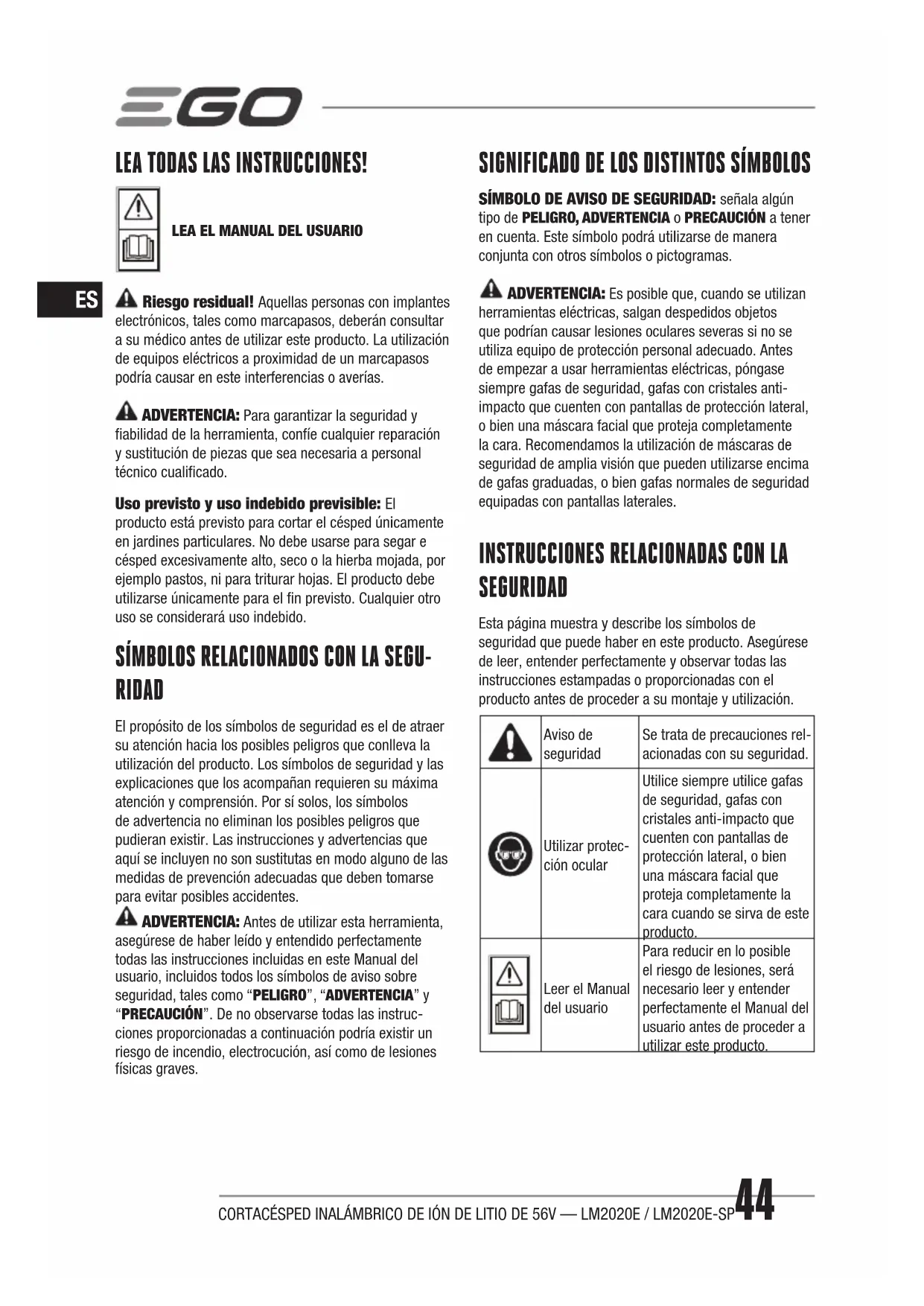 SEGURIDAD Esta página muestra y describe los símbolos de seguridad que puede haber en este producto. Asegúrese de leer, entender perfectamente y observar todas las instrucciones estampadas o proporcionadas con el producto antes de proceder a su montaje y utilización. Aviso de seguridad Se trata de precauciones rel- acionadas con su seguridad. Utilizar protec- ción ocular Utilice siempre utilice gafas de seguridad, gafas con cristales anti-impacto que cuenten con pantallas de protección lateral, o bien una máscara facial que proteja completamente la cara cuando se sirva de este producto. Leer el Manual del usuario Para reducir en lo posible el riesgo de lesiones, será necesario leer y entender perfectamente el Manual del usuario antes de proceder a utilizar este producto.CORTACÉSPED INALÁMBRICO DE IÓN DE LITIO DE 56V — LM2020E / LM2020E-SP