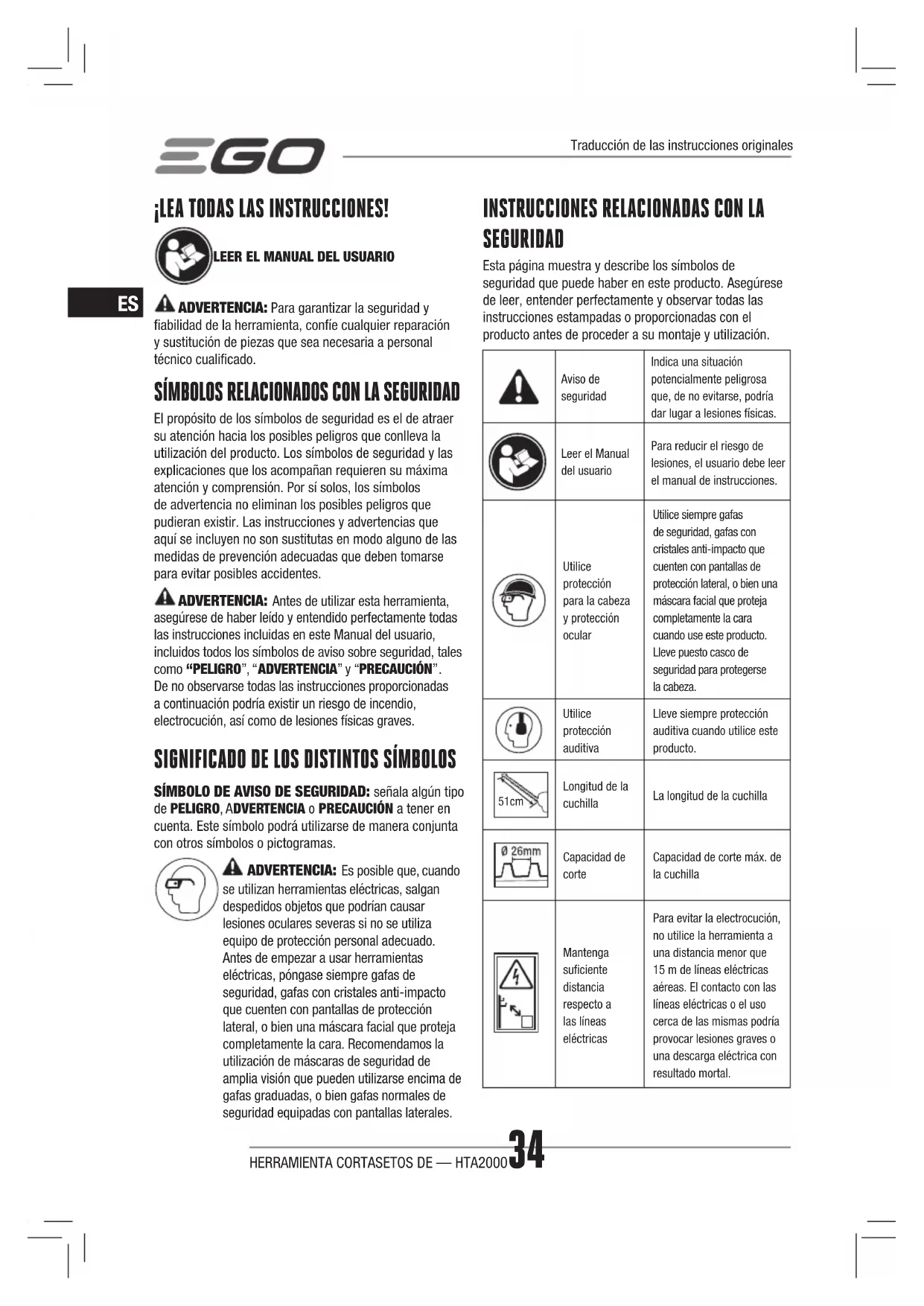 SEGURIDAD Esta página muestra y describe los símbolos de seguridad que puede haber en este producto. Asegúrese de leer, entender perfectamente y observar todas las instrucciones estampadas o proporcionadas con el producto antes de proceder a su montaje y utilización.Aviso de seguridadIndica una situación potencialmente peligrosa que, de no evitarse, podría dar lugar a lesiones físicas.Leer el Manual del usuarioPara reducir el riesgo de lesiones, el usuario debe leer el manual de instrucciones.Utilice protección para la cabeza y protección ocularUtilice siempre gafas de seguridad, gafas con cristales anti-impacto que cuenten con pantallas de protección lateral, o bien una máscara facial que proteja completamente la cara cuando use este producto. Lleve puesto casco de seguridad para protegerse la cabeza.Utilice protección auditivaLleve siempre protección auditiva cuando utilice este producto. 51cm Longitud de la cuchillaLa longitud de la cuchillaCapacidad de corteCapacidad de corte máx. de la cuchillaMantenga suficiente distancia respecto a las líneas eléctricasPara evitar la electrocución, no utilice la herramienta a una distancia menor que 15m de líneas eléctricas aéreas. El contacto con las líneas eléctricas o el uso cerca de las mismas podría provocar lesiones graves o una descarga eléctrica con resultado mortal.Traducción de las instrucciones originalesHERRAMIENTA CORTASETOS DE — HTA2000 35