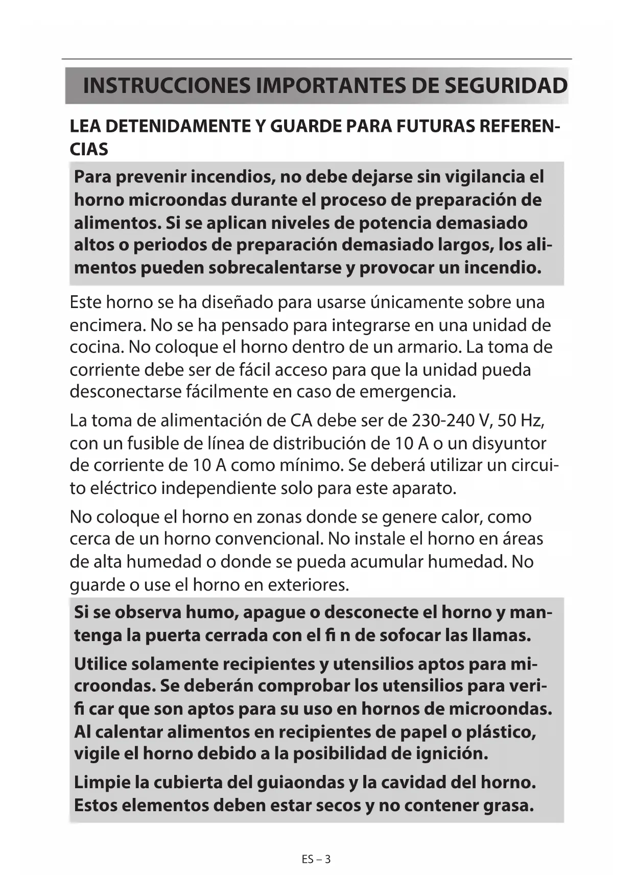 LEA DETENIDAMENTE Y GUARDE PARA FUTURAS REFEREN- CIAS Para prevenir incendios, no debe dejarse sin vigilancia el horno microondas durante el proceso de preparación de alimentos. Si se aplican niveles de potencia demasiado altos o periodos de preparación demasiado largos, los ali- mentos pueden sobrecalentarse y provocar un incendio. Este horno se ha diseñado para usarse únicamente sobre una encimera. No se ha pensado para integrarse en una unidad de cocina. No coloque el horno dentro de un armario. La toma de corriente debe ser de fácil acceso para que la unidad pueda desconectarse fácilmente en caso de emergencia. La toma de alimentación de CA debe ser de 230-240V, 50Hz, con un fusible de línea de distribución de 10A o un disyuntor de corriente de 10A como mínimo. Se deberá utilizar un circui- to eléctrico independiente solo para este aparato. No coloque el horno en zonas donde se genere calor, como cerca de un horno convencional. No instale el horno en áreas de alta humedad o donde se pueda acumular humedad. No guarde o use el horno en exteriores. Si se observa humo, apague o desconecte el horno y man- tenga la puerta cerrada con el n de sofocar las llamas. Utilice solamente recipientes y utensilios aptos para mi- croondas. Se deberán comprobar los utensilios para veri- car que son aptos para su uso en hornos de microondas. Al calentar alimentos en recipientes de papel o plástico, vigile el horno debido a la posibilidad de ignición. Limpie la cubierta del guiaondas y la cavidad del horno. Estos elementos deben estar secos y no contener grasa. ES – 4ES – 4 La grasa acumulada puede recalentarse y provocar humo oincendios. No coloque materiales in amables cerca del horno o los ori - cios de ventilación. No bloquee los ori cios de ventilación. Extraiga todos los sellos metálicos, cierres con alambre, etc., de los alimentos y de los alimentos envasados. Los arcos eléctricos en super cies metálicas pueden provocar incendios. No use el horno microondas para calentar aceite para freír. La temperatura no se puede controlar y el aceite puede incendiar- se. Cuando haga palomitas de maíz, utilice solamente fabricantes especializados en palomitas para microondas. No almacene alimentos u otros artículos dentro del horno. Compruebe la con guración después de encender el horno para asegurarse de que el aparato funciona como se desea. No deje el horno sin atender mientras se usa. Para evitar el calentamiento excesivo y un posible incendio, se debe prestar atención especial al preparar o recalentar alimen- tos con un contenido alto de azúcar o grasa, por ejemplo, sal- chichas, pasteles o pudin de Navidad. Consulte las sugerencias correspondientes en el manual de funcionamiento. Para evitar la posibilidad de lesiones. ADVERTENCIA: No use el horno si está dañado o no funciona correctamente. Compruebe lo siguiente antes de usar: a) Asegúrese de que la puerta está correctamente cerrada y de que no esté desalineada o deformada. b) Asegúrese de que las bisagras y las cerraduras de seguri- dad de la puerta no están rotas ni sueltas. c) Asegúrese de que las juntas de las puertas y super cies de sellado no están dañadas. d) Asegúrese de que interior de la cavidad del horno o laES ES – 3ES – 3