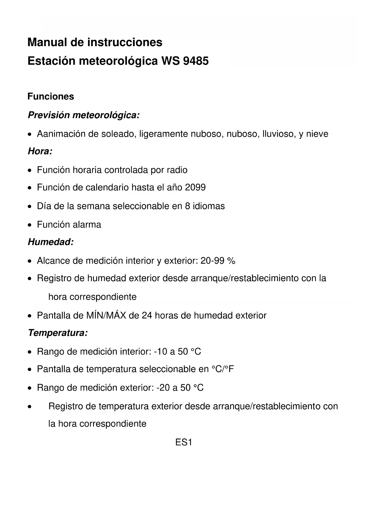 Ce symbole signifie que les appareils électriques ne doivent pas être jetés aux ordures ménagères à la fin de leur vie utile. Ramenez votre appareil à un point de collecte de déchets ou à un centre de recyclage local. Ceci s’applique à tous les pays de l’Union européenne et aux autres pays européens disposant d’un système de collecte sélectif des déchets.ES1 Manual de instrucciones Estación meteorológica WS 9485 Funciones Previsión meteorológica: Aanimación de soleado, ligeramente nuboso, nuboso, lluvioso, y nieve Hora: Función horaria controlada por radio Función de calendario hasta el año 2099 Día de la semana seleccionable en 8 idiomas Función alarma Humedad: Alcance de medición interior y exterior: 20-99 % Registro de humedad exterior desde arranque/restablecimiento con la hora correspondiente Pantalla de MÍN/MÁX de 24 horas de humedad exterior Temperatura: Rango de medición interior: -10 a 50 °C Pantalla de temperatura seleccionable en °C/°F Rango de medición exterior: -20 a 50 °C Registro de temperatura exterior desde arranque/restablecimiento con la hora correspondienteES2 Pantalla de MÍN/MÁX de 24 horas de temperatura exterior Sensor exterior Indicador de batería baja para el sensor de temperatura exterior Montaje en pared o soporte en mesa Un sensor de temperatura inalámbrico incluido Frecuencia de transmisión 433MHz Potencia de transmisión máxima 8dBm: Alcance de transmisión de 60 metros en una zona abierta Vista general de la unidad principalES3 Parte A - pantalla LCD A1: Hora A2: Date A3: Icono de recepción horaria A4: Condición meteorológica actual A5: Previsión meteorológica A6: Temperatura interior A7: Humedad interior A8: Icono de recepción del sensor A9: Temperatura exterior A10: Registro de temperatura exterior más alta en las últimas 24 horas A11: Registro de temperatura exterior más baja en las últimas 24 horas A12: Humedad exterior A13: Registro de humedad exterior más baja en las últimas 24 horas A14: Registro de humedad exterior más alta en las últimas 24 horas Parte B – Botones B1: Botón “▼/(°C/°F)” B2: Botón “MODE/SET” B3: Botón “▲/ ” B4: Botón “SNOOZE/LIGHT” B5: Botón “MEMORY” B6: Botón “RF SEARCH” B7: Botón “WEATHER”ES4 B8: Botón “OUT-TEMP ALERT” B9: Botón “RESET” Parte C – Estructura C1: Cubierta del compartimento de las pilas Vista general del sensor de temperatura exterior