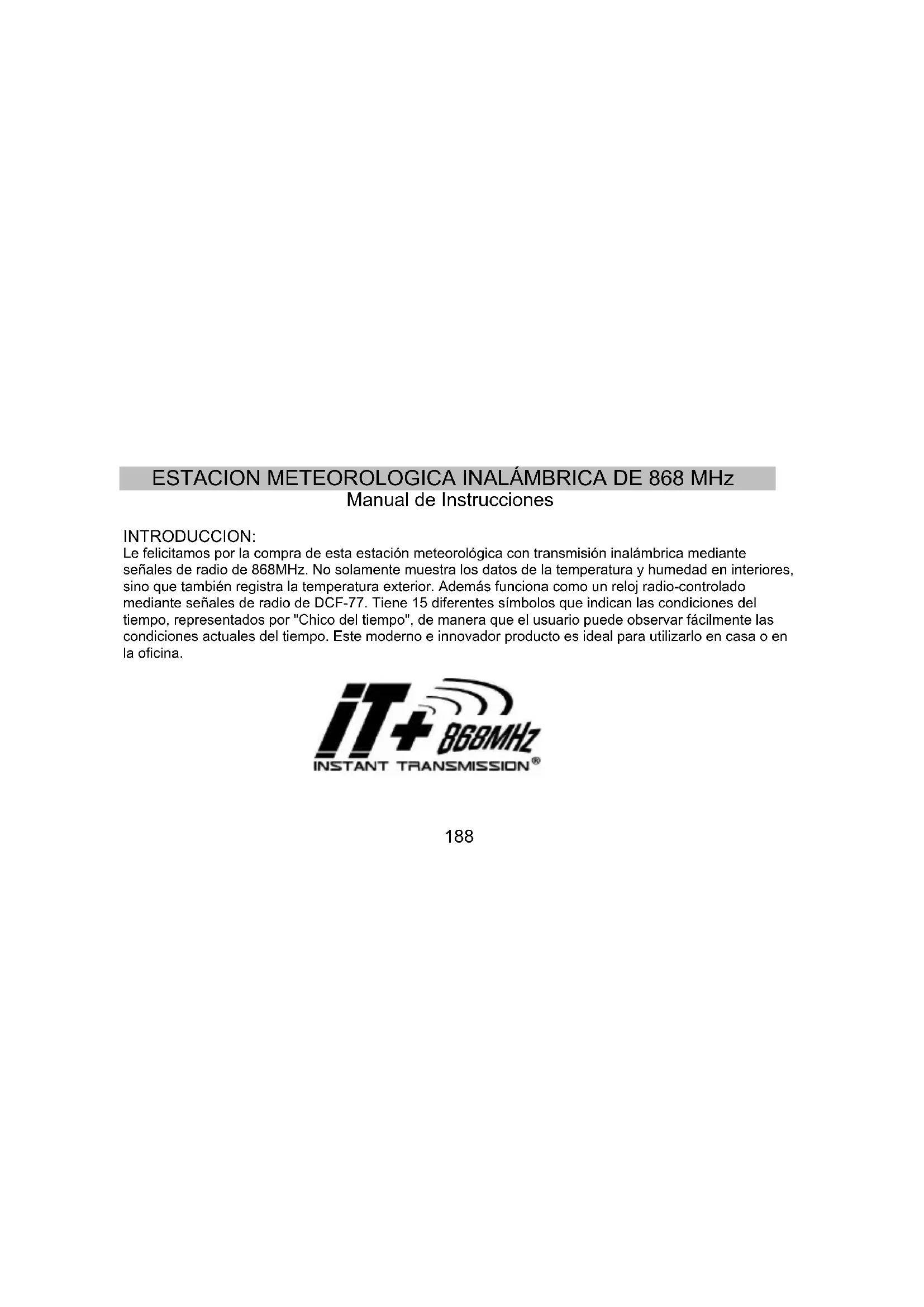 Manual de Instrucciones INTRODUCCION: Le felicitamos por la compra de esta estación meteorológica con transmisión inalámbrica mediante señales de radio de 868MHz. No solamente muestra los datos de la temperatura y humedad en interiores, sino que también registra la temperatura exterior. Además funciona como un reloj radio-controlado mediante señales de radio de DCF-77. Tiene 15 diferentes símbolos que indican las condiciones del tiempo, representados por "Chico del tiempo", de manera que el usuario puede observar fácilmente las condiciones actuales del tiempo. Este moderno e innovador producto es ideal para utilizarlo en casa o en la oficina.189 FUNCIONES Y CARACTERISTICAS: La Estación Meteorológica Teclas de Funcionamiento Pantalla LCD Soporte Compartimiento de las pilas Agujero para colgar190