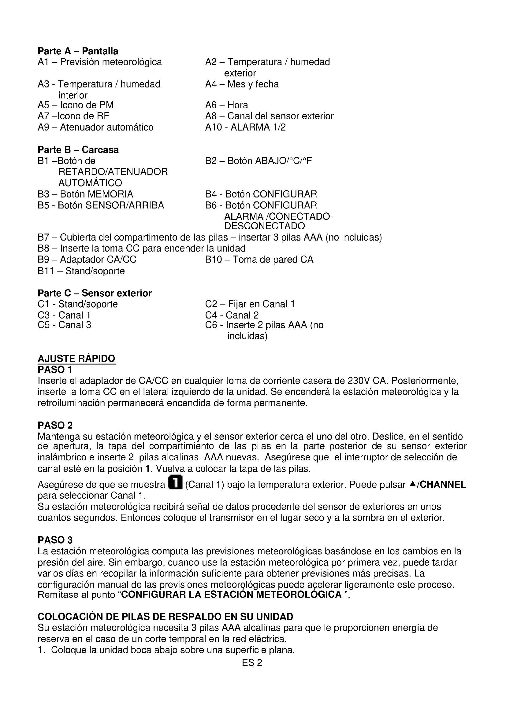 Parte B – Carcasa B1 –Botón de RETARDO/ATENUADOR AUTOMÁTICO B2 – Botón ABAJO/°C/°F B3 – Botón MEMORIA B4 - Botón CONFIGURAR B5 - Botón SENSOR/ARRIBA B6 - Botón CONFIGURAR ALARMA /CONECTADO- DESCONECTADO B7 – Cubierta del compartimento de las pilas – insertar 3 pilas AAA (no incluidas) B8 – Inserte la toma CC para encender la unidad B9 – Adaptador CA/CC B10 – Toma de pared CA B11 – Stand/soporte Parte C – Sensor exterior C1 - Stand/soporte C2 – Fijar en Canal 1 C3 - Canal 1 C4 - Canal 2 C5 - Canal 3 C6 - Inserte 2 pilas AAA (no incluidas)
