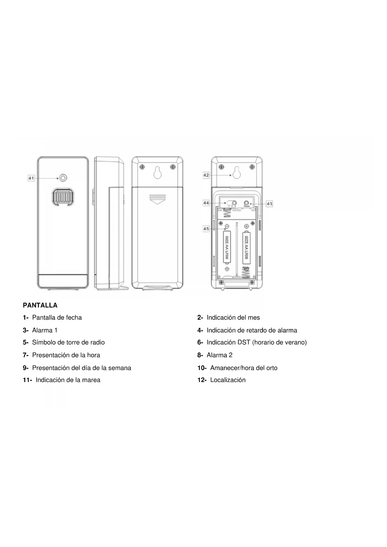 Datos técnicos Estación meteorológica: Margen de medida de la temperatura: 0 hasta +50 °C (+32 hasta +122 °F) Resolución de la temperatura: 0,1°C Margen de medida de la humedad: 20% – 95% Resolución de humedad: 1% Señal de radio: DCF Pilas: 2 pilas AA de 1,5 VCC Rango de la presión atmosférica: 850 - 1050 hPa Banda de frecuencias: 433.050 - 434.790 MHz Sensor exterior: Margen de medida de la temperatura: -20 hasta +65 °C (-4 hasta +149 °F) Margen de medida de la humedad: 20% – 95% Resolución de humedad: 1% Señal de transmisión RF: 433,92 MHzAlcance de la transmisión RF: 60 m máx. (en zona sin obstáculos) Pilas: 2 pilas AA de 1,5 VCC Antes de usar Configurar el dispositivo Primero coloque las pilas en el sensor exterior. ¡PRECAUCIÓN! Cuando elija la ubicación de la estación meteorológica, asegúrese de que no quede expuesta a la luz directa del sol, vibraciones, polvo, calor, frío o humedad. No coloque los dispositivos cerca de fuentes de calor, p. ej. radiadores. De lo contrario podría sufrir daños. No coloque los dispositivos sobre superficies delicadas o valiosas, a menos que estén correctamente protegidas. De lo contrario podría sufrir daños. Asegúrese de que otros dispositivos próximos no funciones con la misma frecuencia de 433 MHz. Tales dispositivos podría causar interferencias en la conexión radio. No coloque los dispositivos sobre placas metálicas ni en sus proximidades. De lo contrario, la calidad de la transmisión de la onda de radio puede verse reducida. No instale los dispositivos en edificios hechos de hormigón armado, p. ej. aeropuertos, rascacielos, fábricas o bodegas. De lo contrario, la transmisión de las ondas de radio entre los dispositivos puede verse gravemente deteriorada.Preparar el sensor exterior para su uso Retire la tapa del compartimiento de las pilas de la parte trasera del sensor. Inserte 2 pilas con la polaridad correcta conforme a las marcas (+/-). El sensor exterior ya está listo para operar y las luces del LED de control (41) se encenderán momentáneamente. Cierre la tapa del compartimiento de las pilas. Instalar el sensor exterior: Encuentre un lugar apropiado para el sensor exterior. Nota: Asegúrese de instalar el sensor exterior a menos de 60 m (en área sin obstáculos) de la estación meteorológica. Compruebe que no existan obstáculos entre el sensor exterior y la estación meteorológica. De lo contrario podrían generar interferencias en la transmisión de datos. Para montaje en la pared: Cuelgue el sensor sobre un tornillo usando el orificio de montaje (42). Preparar la estación meteorológica para su uso Abra el compartimiento de las pilas (42) en la parte trasera de la estación meteorológica. Inserte 2 pilas con la polaridad correcta conforme a las marcas (+/-). Después cierre el compartimiento de las pilas. Tan pronto como se retira la cinta de seguridad de la pila, la estación meteorológica empieza a recibir la señal de radio. Nota: No mueva la estación meteorológica mientras esté recibiendo la señal. Podría interrumpir la recepción.Conectar la estación meteorológica con el sensor exterior y la señal de radio DCF: Después de instalar las pilas, la estación meteorológica intentará establecer la conexión con el sensor exterior. Este proceso puede durar varios minutos. El símbolo permanecerá parpadeando varios minutos. Cuando se conecte correctamente con el sensor exterior, el símbolo del canal seleccionado (27) aparecerá en la pantalla LCD con el canal del sensor exterior (si fuese necesario podría cambiar el canal del sensor exterior como se muestra en la sección "Configurar el canal"). Si no es posible establecer automáticamente la conexión con el sensor exterior, podrá efectuarla manualmente del modo siguiente: Pulse brevemente el botón de selección de canal (CH) (37) hasta que se muestre el canal que desee (27) y, a continuación, mantenga pulsado el botón CH hasta que el icono de las ondas de radio empiece a parpadear. T Luego pulse el botón RESET (43) del sensor. Aparecerán en pantalla la temperatura en exteriores (25) y la humedad (exteriores) (22). Tan pronto como la estación meteorológica haya establecido conexión con el sensor exterior, empezará a recibir automáticamente la señal de radio DCF. Este proceso dura varios minutos y se indica con el símbolo de la torre de radio (5) parpadeando. Cuando se reciba correctamente la señal de radio DFC, el símbolo de la torre de radio se mostrará en pantalla sin parpadear. Si al poner el dispositivo en funcionamiento no es posible la sincronización con el reloj atómico, también podrá realizar manualmente los ajustes del reloj (sección "Configurar manualmente el modo 12/24 horas / °C / °F / hPa / inHg / zona horaria / hora/ fecha / idioma").Señal de radio (DCF): La señal DFC (transmisor de señal horaria) consiste en pulsos horarios transmitidos por uno de los relojes más precisos del mundo, próximo a Frankfurt / Main, Alemania. En condiciones ideales, su estación meteorológica puede recibir esta señal a una distancia de hasta 2000 km aprox. desde Franckfurt/Main. La recepción de la señal de radio tarda aprox. de 3 a 10 minutos. La recepción puede verse reducida considerablemente por los obstáculos (p. ej. paredes de cemento) o fuentes de interferencia (p. ej. otros dispositivos eléctricos). En el caso de tener problemas de recepción, cambie la ubicación de la estación meteorológica (p. ej. cerca de la ventana). Funcionamiento Recibir la señal horaria de radio DCF Después de establecer la conexión con el sensor exterior o 3 minutos después de instalar las pilas, la estación meteorológica inicia la búsqueda de la señal de radio DCF. La búsqueda se muestra en la pantalla LCD mediante el símbolo de la torre de radio (5) parpadeando. Nota: En los edificios hechos de cemento armado la recepción de la señal de radio puede verse gravemente deteriorada (consulte "configurar los
