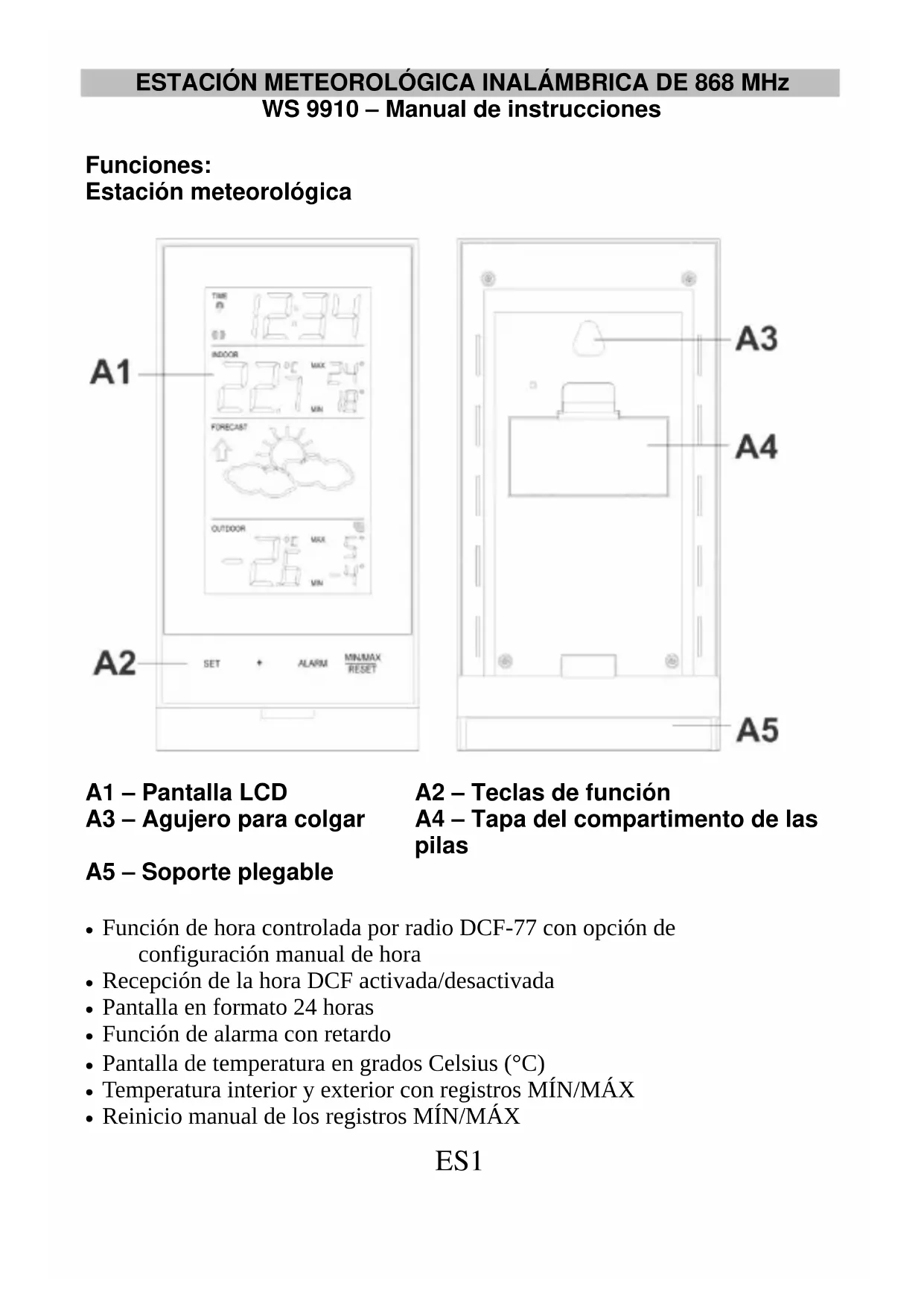 A1 – Pantalla LCD A2 – Teclas de función A3 – Agujero para colgar A4 – Tapa del compartimento de las pilas A5 – Soporte plegable Función de hora controlada por radio DCF-77 con opción de configuración manual de hora Recepción de la hora DCF activada/desactivada Pantalla en formato 24 horas Función de alarma con retardo Pantalla de temperatura en grados Celsius (°C) Temperatura interior y exterior con registros MÍN/MÁX Reinicio manual de los registros MÍN/MÁXES2 3 símbolos de previsión meteorológica con indicador de tendencia meteorológica Transmisión inalámbrica a 868 MHz Intervalos de recepción de señal de 4 segundos Indicador de batería baja Montaje en pared o soporte para mesa (soporte plegable) Sensor de temperatura exterior Transmisión a distancia de la temperatura exterior a la estación de temperatura mediante señales de 868 MHz Carcasa a prueba de lluvia Montaje en pared o soporte de mesa Si desea llevar el producto a Europa Central, encontrará automáticamente la señal horaria controlada por radio. Si desea ir al Reino Unido, siga la opción de configuración horaria manual. Ajustes iniciales: Nota: Esta estación meteorológica solo recibe un sensor exterior.