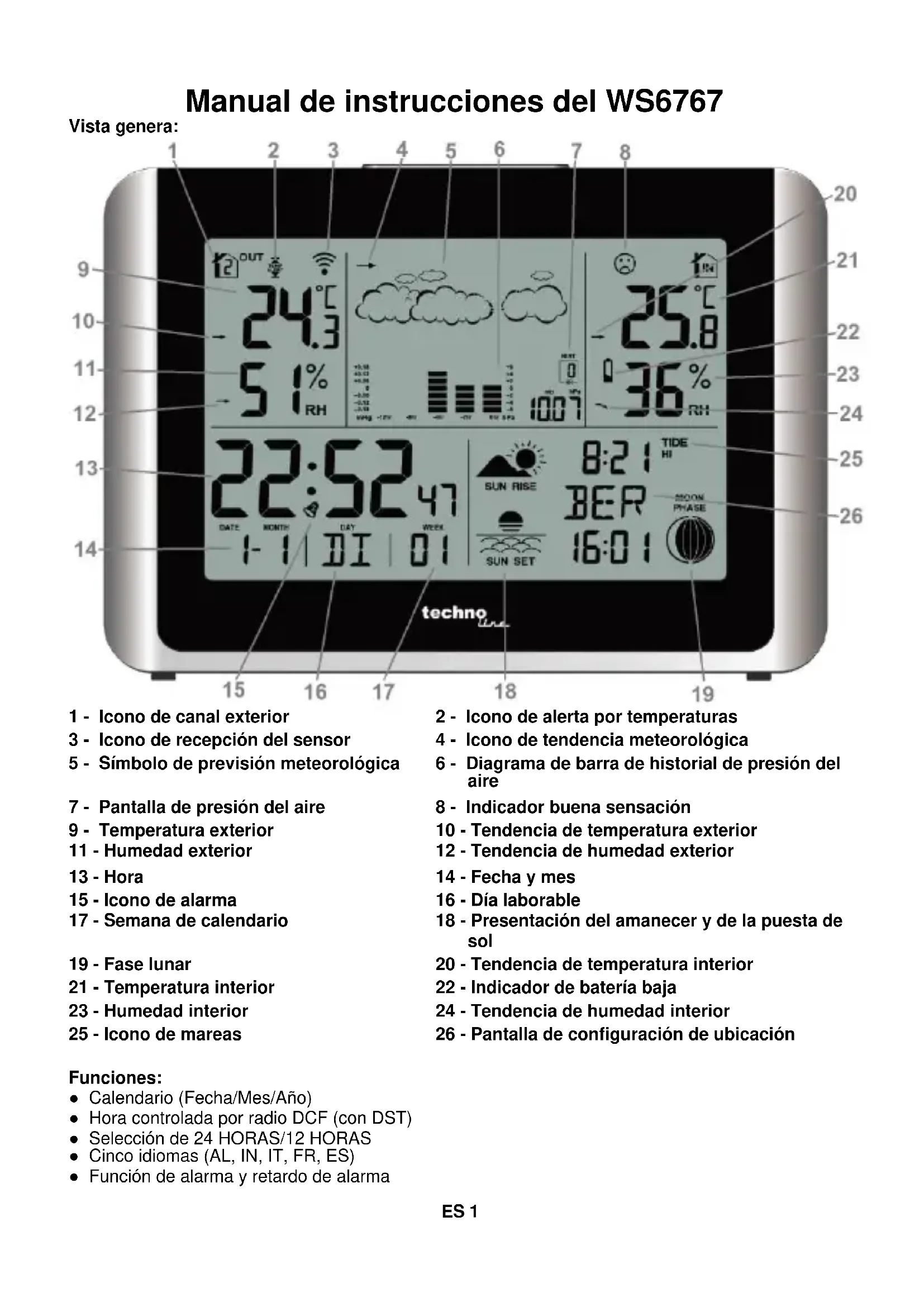 Funciones: ● Calendario (Fecha/Mes/Año) ● Hora controlada por radio DCF (con DST) ● Selección de 24 HORAS/12 HORAS ● Cinco idiomas (AL, IN, IT, FR, ES) ● Función de alarma y retardo de alarmaES 2 ● Días laborables ● seleccionable en °C/°F ● Fase lunar ● Temperatura y humedad interior / exterior ● Tendencia de temperatura y humedad interior / exterior ● Salida del sol / Puesta de sol ● Indicador de alimentación interior / exterior baja ● Indicador de comodidad interior ● Configuración de zona horaria ● Número de semana ● Pantalla de mareas altas / medias / bajas ● Gráfico de barras de presión ● Estación meteorológica ● Registros máximos / mínimos de humedad / temperatura interior/exterior ● Canal seleccionado ● Selección de ubicación ● Alerta de temperatura ● Alerta de congelación Pilas: Receptor (WS6767): 2 AA Sensor (TX960-TH): 2 X AAA Pantalla LCD completa: