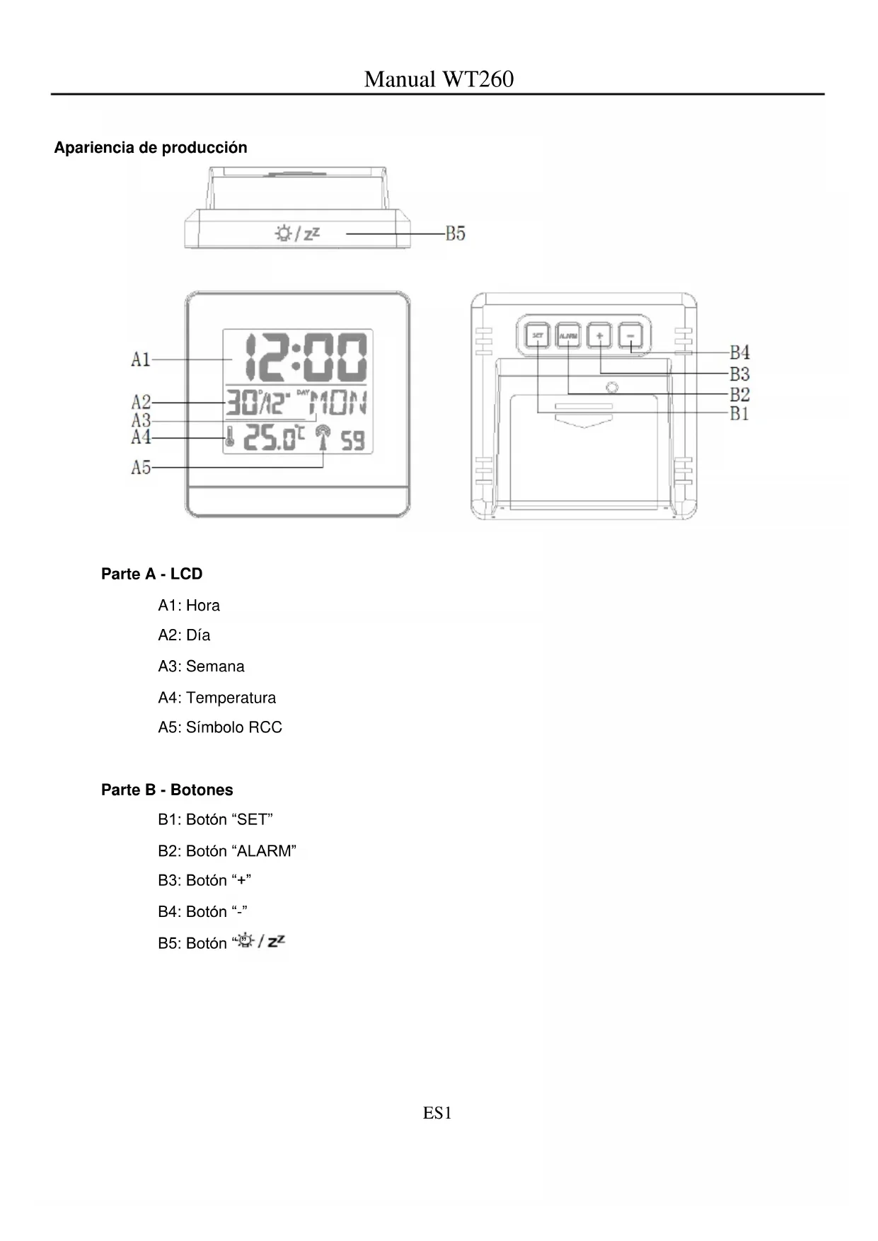Parte A - LCD A1: Hora A2: Día A3: Semana A4: Temperatura A5: Símbolo RCC Parte B - Botones B1: Botón “SET” B2: Botón “ALARM” B3: Botón “+” B4: Botón “-” B5: Botón “ ”ES2 Funciones: Reloj DCF-77 controlado por radio Formato de la hora en 12/24 Ajuste manual de la hora Calendario continuo hasta el año 2099 Pantalla de fecha y día de la semana Temperatura alternativamente en °C o °F Función de retardo automática (5 minutos) Termómetro: Alcance de la medición interna: -9,9 °C ~ 49,9 °C Pilas: 2 pilas de 1.5V tamaño “AAA” (no incluidas) Funcionamiento inicial: Abra la tapa del compartimernto de las pilas Inserte 2 pilas AAA observando la polaridad [marcas “+” y “–”] Al insertar las pilas, todos los iconos de la pantalla LCD se iluminarán durante 3 segundos, se escuchará un pitido y la estación detectará automáticamente la temperatura interior. Recepción de la señal de radiocontrol DCF: El reloj buscará automáticamente la señal DCF después de encenderse. El icono del mástil de radio empieza a parpadear. A la 1:00 am el reloj de radiocontrol realiza automáticamente el procedimiento de sincronización con la señal DCF para corregir cualquier desviación de la hora exacta. Si el intento de sincronización no tiene éxito (el icono del mástil de la radio desaparece de la pantalla), el sistema intentará automáticamente otra sincronización después de una hora. Este procedimiento se repite automáticamente hasta un total de 5 veces. Para iniciar la recepción de la señal DCF manual, mantenga pulsado el botón “-”. Si no recibe señal en un periodo de siete minutos, la búsqueda de señal DCF se detendrá (el icono del mástil de la radio desaparece de la pantalla) y empezará de nuevo después de una hora. Por favor tenga en cuenta: Si el reloj no puede recibir la señal DCF (porque la distancia es demasiado grande para recibir una señal del transmisor de Mainflingen, Alemania), puede ajustar el tiempo manualmente como se describe a continuación. En cuanto sea posible recibir la señal DCF el reloj se reajustará automáticamente. Recomendamos mantener una distancia mínima de 2,5 metros (8,2 pies) respecto a toda fuente deES3 interferencias, como televisores o monitores de ordenador. La recepción de radio es más débil en salas con paredes de hormigón y en oficinas. En tales condiciones extremas, coloque el reloj cerca de una ventana. Ajuste manual de la hora: Mantenga pulsado el botón “SET” durante dos segundos y el indicador 12/24HR empezará a parpadear. Ahora use los botones “+” y “-” para cambiar el modo de horas 12/24. Pulse “SET” para confirmar la configuración y la zona horaria empezará a parpadear. Use los botones “+” y “-” para configurar una zona horaria correcta. Para configurar la hora de Reino Unido, seleccione la zona horaria -1. Pulse “SET” para confirmar la configuración y la hora empezará a parpadear. Ahora use los botones “+” y “-” para configurar la hora. Pulse “SET” para confirmar la configuración y los minutos empezarán a parpadear. Ahora use los botones “+” y “-” para configurar los minutos. Pulse “SET” para confirmar la configuración y el año 2009 empezará a parpadear. Ahora use los botones “+” y “-” para configurar el año. Pulse “SET” para confirmar la configuración y el mes empezará a parpadear. Ahora use los botones “+” y “-” para configurar el mes. Pulse “SET” para confirmar la configuración y la fecha empezará a parpadear. Ahora use los botones “+” y “-” para configurar la fecha. Pulse “SET” para confirmar la configuración y el idioma de los días empezará a parpadear. Ahora use los botones “+” y “-” para configurar el idioma de los días en GER, ENG, ITA, FRE, DUT, SPA o DAN. Pulse “SET” para confirmar y finalizar el procedimiento de configuración y entrar en el modo de reloj. Por favor tenga en cuenta: Si no se realiza una operación válida en un periodo de 30 segundos, el reloj volverá automáticamente al modo de hora normal. Configurar la alarma diaria: Mantenga pulsado el botón “ALARM” durante 2 segundos hasta que parpadee la hora de alarma. El dígito de hora de la hora de alarma empezará a parpadear. Use los botones “+” y “-” para configurar la hora. Pulse el botón “ALARM” para confirmar la configuración. El dígito de minutos de la hora de alarma empezará a parpadear. Use los botones “+” y “-” para configurar los minutos. Pulse el botón “ALARM” para confirmar y finalizar el procedimiento de configuración. Para activar o desactivar las alarmas diarias, pulse una vez el botón “ALARM”. Cuando esté activa,ES4 aparecerá un icono de campana. Por favor tenga en cuenta: Si no se realiza una operación válida en un periodo de 30 segundos, el reloj volverá automáticamente al modo de hora normal. La alarma sonará durante 2 minutos si no la desactiva pulsando cualquier botón. En este caso la alarma se repetirá automáticamente transcurridas 24 horas. Subir el sonido de la alarma (crescendo, duración: 2 minutos) Función de repetición automática: Mientras suene la alarma, toque “ ” para activar la función de repetición. La función de repetición está activa y en la pantalla aparece un icono “ ” parpadeante. Esto detendrá la alarma durante 5 minutos y después volverá a sonar. Se puede interrumpir la función de repetición pulsando cualquier botón. Presentación de la temperatura °C/°F: La temperatura se muestra en °C o °F. Puede alternar entre °C o °F pulsando el botón “-”. Por medio de la presente Technotrade declara que el WT260 cumple con los requisitos esenciales y cualesquiera otras disposiciones aplicables o exigibles de la Directiva 2014/53/EU y ROHS 2011/65/CE. El original de la declaración de conformidad UE se puede encontrar en: www.technoline.de/doc/4029665002606 Datos técnicos: Vida úti
