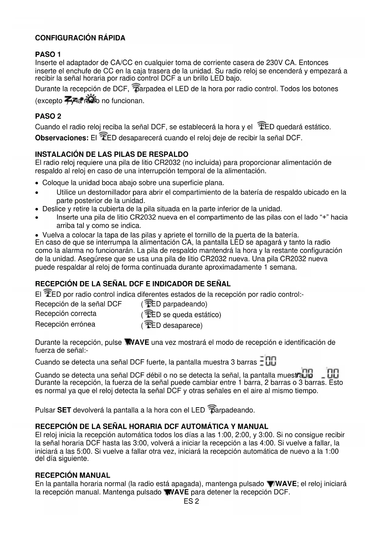 Durante la recepción, pulse /WAVE una vez mostrará el modo de recepción e identificación de fuerza de señal:- Cuando se detecta una señal DCF fuerte, la pantalla muestra 3 barras Cuando se detecta una señal DCF débil o no se detecta la señal, la pantalla muestra o Durante la recepción, la fuerza de la señal puede cambiar entre 1 barra, 2 barras o 3 barras. Esto es normal ya que el reloj detecta la señal DCF y otras señales en el aire al mismo tiempo. Pulsar SET devolverá la pantalla a la hora con el LED parpadeando. RECEPCIÓN DE LA SEÑAL HORARIA DCF AUTOMÁTICA Y MANUAL El reloj inicia la recepción automática todos los días a las 1:00, 2:00, y 3:00. Si no consigue recibir la señal horaria DCF hasta las 3:00, volverá a iniciar la recepción a las 4:00. Si vuelve a fallar, la iniciará a las 5:00. Si vuelve a fallar otra vez, iniciará la recepción automática de nuevo a la 1:00 del día siguiente.