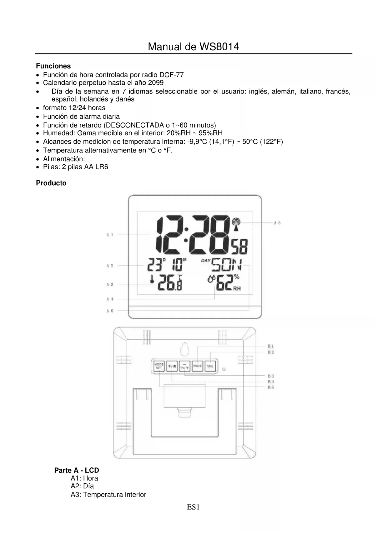 Séparez le carton d’emballage de tout sous carton éventuel en plastique. Tout bien trier conformément aux règlementations en matière de séparation des déchets.ES1 Manual de WS8014 Funciones Función de hora controlada por radio DCF-77 Calendario perpetuo hasta el año 2099 Día de la semana en 7 idiomas seleccionable por el usuario: inglés, alemán, italiano, francés, español, holandés y danés formato 12/24 horas Función de alarma diaria Función de retardo (DESCONECTADA o 1~60 minutos) Humedad: Gama medible en el interior: 20%RH ~ 95%RH Alcances de medición de temperatura interna: -9,9°C (14,1°F) ~ 50°C (122°F) Temperatura alternativamente en °C o °F. Alimentación: Pilas: 2 pilas AA LR6 Producto