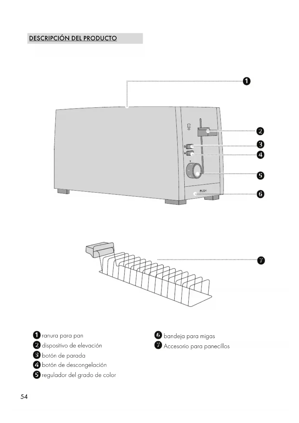 Para preparar los panecillos, proceda de la siguiente manera: ● Coloque el accesorio para panecillos sobre el aparato. ● Coloque los panecillos en el accesorio para panecillos. ● Mueva el regulador del grado de tueste en el símbolo de panecillos. ● Presione el botón de elevación hacia abajo hasta que engarce. ● Cuando el botón de elevación está de nuevo arriba dele la vuelta al panecillo y repita el procedimiento. Der Accesorio para panecillos se calienta mientras tuesta. Coja el accesorio únicamente por el asa. LIMPIEZA ● Limpie la superficie externa del aparato con un paño suave y húmedo. En caso de sucie- dad incrustada, se puede utilizar un producto de limpieza suave. ● Las migas que caen se recogen en la bandeja para migas. ● Para extraer la bandeja pulse el botón «Push». ● Saque la bandeja y vacíe las migas. ● Vuelva a insertar la bandeja para migas.