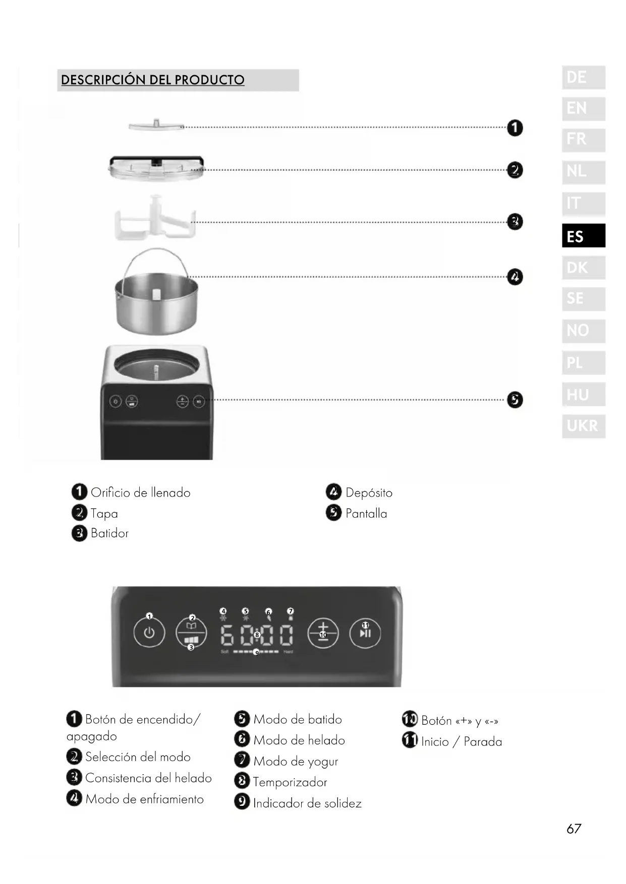 UKR ● Prepare los ingredientes tal como se indica en la receta correspondiente. Las masas de helado que deben ser cocidas antes deberían prepararse el día anterior, para que tengan suficiente tiempo para enfriar. ● Introduzca la masa de helado en el depósito extraíble y meta el depósito en el aparato. Tenga en cuenta que el nivel máximo de llenado del depósito es de 2/3 (Max ), pues durante el enfriamiento la masa se dilata. ● Coloque el batidor en el depósito extraíble y gírelo ligeramente, para que baje en la po- sición correcta. ● Ponga la tapa transparente en el aparato y bloquéelo en sentido antihorario. ● Enchufe el aparato a la toma de corriente. En la pantalla aparece “- -”. ● Encienda el aparato . ● El aparato inicia el modo de helado. La pantalla mostrará el temporizador (60:00).