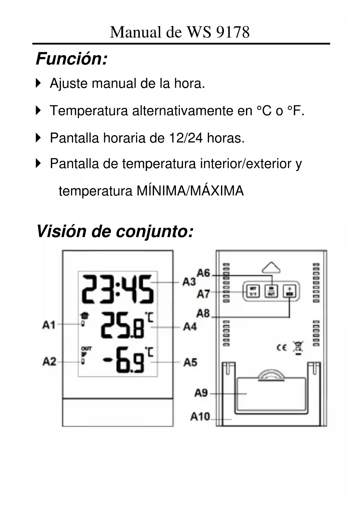 Funcionamiento inicial: Abra el compartimento de las pilas situado en el sensor remoto exterior e inserte 2 pilas AA. El interruptor de canal (al lado del botón "Reset") debe establecerse en 1. Cierre el compartimento de las pilas. Abra el compartimento de las pilas situadoManual de WS 9178 en la parte posterior de la estación base inserte 2 pilas AAA. Por favor, cumpla con la polaridad correcta. Cierre el compartimento de las pilas. Tras insertar las pilas, todos los iconos de la pantalla LCD se iluminarán brevemente durante 3 segundos. La estación base ahora empezará a realizar la conexión con el sensor de temperatura externo. Esta operación tarda aproximadamente 3 minutos y se muestra mediante un símbolo de antena de recepción de radio que parpadea en la zona de pantalla “OUTDOOR” de la estación base.Manual de WS 9178 Ajuste manual de la hora: Pulse el botón “SET” durante aproximadamente 3 segundos para confirmar su configuración; el modo horario 12/24 empieza a parpadear. Pulse el botón “+”para fijar el modo horario 12/24 correcto. Vuelva a pulsar el botón “SET” para confirmar su configuración; la pantalla de la hora empieza a parpadear. Pulse el botón “+” para fijar la hora correcta. Vuelva a pulsar el botón “SET” para confirmar su configuración; la pantalla de los minutos empieza a parpadear. Pulse el botón “+” para fijar los minutos correctos. Vuelva a pulsar el botón “SET” paraManual de WS 9178 confirmar su configuración y finalizar el procedimientos de configuración; entre en el modo de pantalla horaria. Nota: Tras 30 segundos, tras pulsar cualquier botón, el reloj cambia automáticamente desde el modo configuración al modo de pantalla horaria. Presentación de la temperatura °C/°F: La temperatura se muestra bien en °C o °F. Pulse el botón “°C/°F” para cambiar las unidades de medición individuales.Manual de WS 9178 Pantalla de temperatura máxima/mínima: Para cambiar ente el valor máximo interior/exterior, pulse el botón “MEM”. Una vez para mostrar los valores de temperatura máximos interiores/exteriores. Dos veces para mostrar los valores de temperatura mínimos interiores/exteriores. Tres veces para volver a los valores de la temperatura actual. Para reiniciar la temperatura máxima y mínima, mantenga pulsado el botón “MEM” durante aproximadamente 3 segundos. Esto reiniciará los datos máximos y mínimos registrados en los valores que se muestran actualmente.Manual de WS 9178 Pantalla de temperatura INTERIOR/EXTERIOR: Pulse la tecla "IN / OUT" para cambiar la posición de la temperatura interior y exterior en la pantalla. Sensor inalámbrico remoto (transmisor) Frecuencia del transmisor: 433,92 MHz. El alcance de la transmisión de hasta 60m (200 pies). Inserte 2 pilas AA en el transmisor; por favor, cumpla con la polaridad correcta. Mantenga presionado el botón "IN / OUT" durante 3 segundos para buscarManual de WS 9178 manualmente una señal de sensor exterior. Especificaciones: Termómetro: Alcance de mediciones internas: 0°C (32°F) ~ 50°C (122°F)