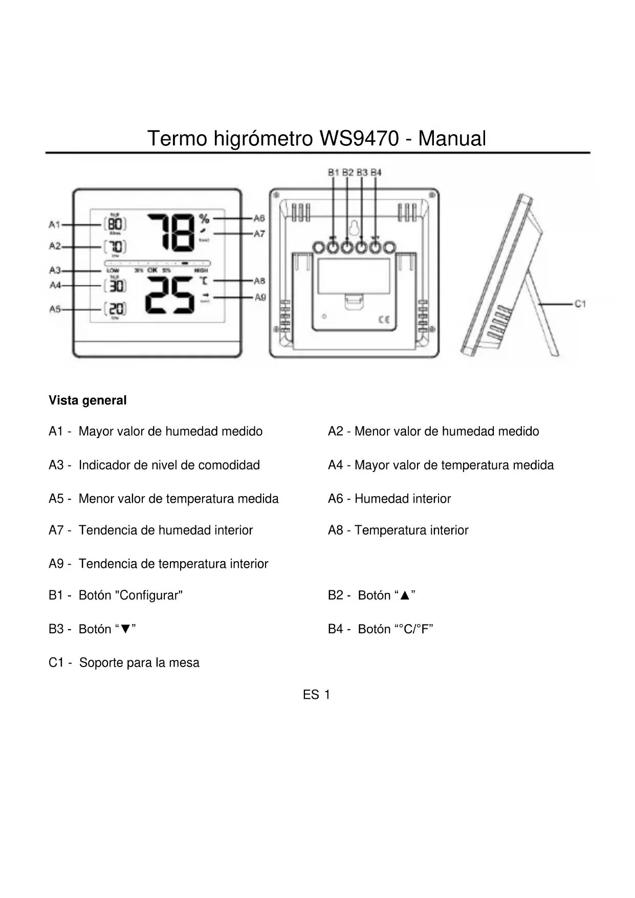 B1 - Botón "Configurar" B2 - Botón “▲” B3 - Botón “▼” B4 - Botón “°C/°F” C1 - Soporte para la mesaES 2 Comienzo Abra el compartimento de las pilas. Inserte 2 pilas AAA de 1.5V conforme a la polaridad correcta tal y como se indica en el compartimento de las pilas. Aparecerán en la pantalla la temperatura y humedad medidas. Vuelva a cerrar el compartimento de las pilas. Indicador de temperatura Pulse el botón °C/°F para cambiar la unidad de temperatura entre °C (Celsius) o °F (Fahrenheit). Indicador de tendencia Las flechas de tendencia indican si los valores de temperatura y humedad actualmente aumentan (fleche hacia arriba), se mantienen estables (fleche hacia los lados) o disminuyen (flecha hacia abajo).ES 3 Nivel de comodidad En la pantalla aparece una marca para indicar el nivel de comodidad: Una marca cercana a LOW (BAJO) significa que el entorno es demasiado seco. Una marca cerda de OK significa que el entorno es cómodo. Una marca cerca de HIGH (ALTO) significa que el entorno es demasiado húmedo. Valores máximos y mínimos Existen dos modos de memoria para mostrar los valores más altos y más bajos de high y low para la temperatura y humedad. Pulse el botón ▲ o ▼ en modo normal para ver el modo de pantalla 24hrs o all-time de los valores máximos y mínimos. Modo All-time: Tan pronto como la estación esté activa se guardarán los valores máximos y mínimos. Modo 24hrs: Se reiniciarán los valores máximos y mínimos cada 24 horas (desde el momento de la activación).ES 4 Reinicio manual Mantenga pulsado el botón ▲ en el modo de pantalla respectivo para eliminar la lectura grabada alta. Mantenga pulsado el botón ▼ en el modo de pantalla respectivo para eliminar la lectura grabada baja. Función de calibración El termo higrómetro permite al usuario calibrar la pantalla de las mediciones de temperatura y humedad con una mejor fuente de referencia externa. El usuario puede realizar ajustes a las pantallas de temperatura y humedad dentro del alcance de la medición. Cuando sustituya las pilas se eliminan automáticamente los valores calibrados.ES 5 Calibración de la pantalla de temperatura y humedad Mantenga pulsado el botón SET durante 3 segundos y la humedad parpadea. Pulse el botón ▲ o ▼ para corregir la pantalla de la humedad. CALIBRATED aparece bajo la humedad en la pantalla. Pulse brevemente el botón SET para confirmar los cambios y la temperatura parpadea. Pulse el botón ▲ o ▼para corregir la pantalla de la temperatura. CALIBRATED aparece bajo la pantalla de la temperatura. Pulse brevemente el botón SET para confirmar los cambios y salir del modo de configuración. Nota: CALIBRATED se muestra en la pantalla siempre y cuando los valores permanezcan calibrados. Icono de bacteria baja Cambie las pilas una vez que el símbolo de las pilas aparezca en la pantalla.ES 6 Precauciones Esta unidad tiene como finalidad su uso en el interior. No golpee la unidad ni la someta a una fuerza excesiva. No exponga la unidad a temperaturas extremas, luz directa del sol, polvo o humedad. No la sumerja en el agua. Evite que entre en contacto con materiales corrosivos. No se deshaga de la unidad arrojándola al fuego, ya que podría explotar. No abra la carcasa posterior interna ni altere ningún componente de la unidad. Advertencias de seguridad sobre las pilas Use solamente pilas alcalinas, no use pilas recargables. Instale las pilas correctamente, haciendo coincidir las polaridades (+/-). Siempre cambie el juego completo de pilas. Nunca mezcle baterías usadas y nuevas. Quite las pilas agotadas de inmediato. Quite las pilas cuando no se utilicen. No las recargue ni las deseche en el fuego, ya que pueden explotar.ES 7 Asegúrese de que las pilas estén almacenadas lejos de objetos metálicos, ya que el contacto con ellos puede causar un cortocircuito. Evite exponer las pilas a temperaturas extremas, a la humedad o a los rayos directos del sol. Mantenga todas las pilas lejos del alcance de los niños. Constituyen peligro de asfixia. ¡Use el producto únicamente para la finalidad prevista! Consideración de obligaciones según la ley sobre pilas Las pilas viejas no pertenecen a los residuos domésticos porque pueden causar daños a la salud y al medioambiente. Puede devolver las pilas usadas sin cargo alguno a su distribuidor y puntos de recogida. ¡Como usuario final, tiene la obligación de devolver las pilas que utilice a su distribuidor y otros puntos de recogida!ES 8 Consideración de obligaciones según las leyes sobre dispositivos electrónicos Este símbolo indica que debe deshacerse de los dispositivos eléctricos separados de los residuos domésticos generales cuando alcance el final de su vida útil. Lleve su unidad a su punto de recogida selectiva de basura o al centro de reciclaje de su localidad. Esto es de aplicación en todos los países de la Unión Europea, y en otros países no europeos con sistema de recogida selectiva de basuras.NL 1 WS9470 Thermo-hygrometer - Handleiding Overzicht A1 - Hoogst gemeten vochtigheidswaarde A2 - Laagst gemeten vochtigheidswaarde A3 - Indicator comfortniveau A4 - Hoogst gemeten temperatuur A5 - Laagst gemeten temperatuur A6 - Binnenvochtigheid A7 - Trend van binnenvochtigheid A8 - Binnentemperatuur A9 - Trend van binnentemperatuur