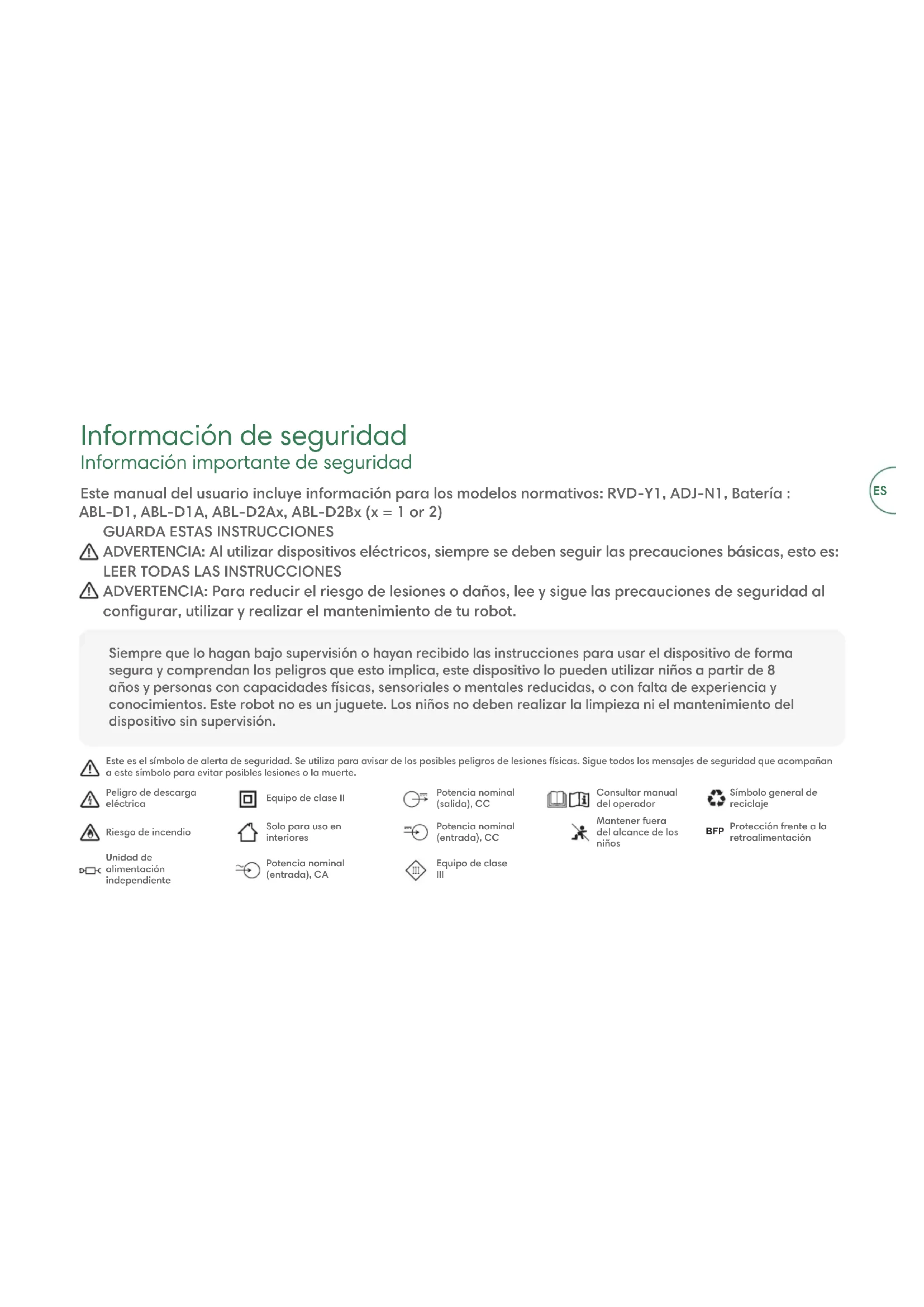 ADVERTENCIA: Para reducir el riesgo de lesiones o daños, lee y sigue las precauciones de seguridad al congurar, utilizar y realizar el mantenimiento de tu robot. Este manual del usuario incluye información para los modelos normativos: RVD-Y1, ADJ-N1, Batería : ABL-D1, ABL-D1A, ABL-D2Ax, ABL-D2Bx (x = 1 or 2) Este es el símbolo de alerta de seguridad. Se utiliza para avisar de los posibles peligros de lesiones físicas. Sigue todos los mensajes de seguridad que acompañan a este símbolo para evitar posibles lesiones o la muerte.Peligro de descarga eléctricaEquipo de clase IIPotencia nominal (salida), CC Consultar manual del operadorSímbolo general de reciclajeRiesgo de incendioSolo para uso en interioresPotencia nominal (entrada), CCMantener fuera del alcance de los niños BFP Protección frente a la retroalimentaciónUnidad de alimentación independientePotencia nominal (entrada), CAEquipo de clase III ESADVERTENCIA: Indica una situación peligrosa que, si no se evita, puede causar lesiones graves, incluso la muerte. PRECAUCIÓN: Indica una situación peligrosa que, si no se evita, puede causar lesiones leves o moderadas. AVISO: Indica una situación peligrosa que, si no se evita, puede causar daños en la propiedad. GENERAL ADVERTENCIA