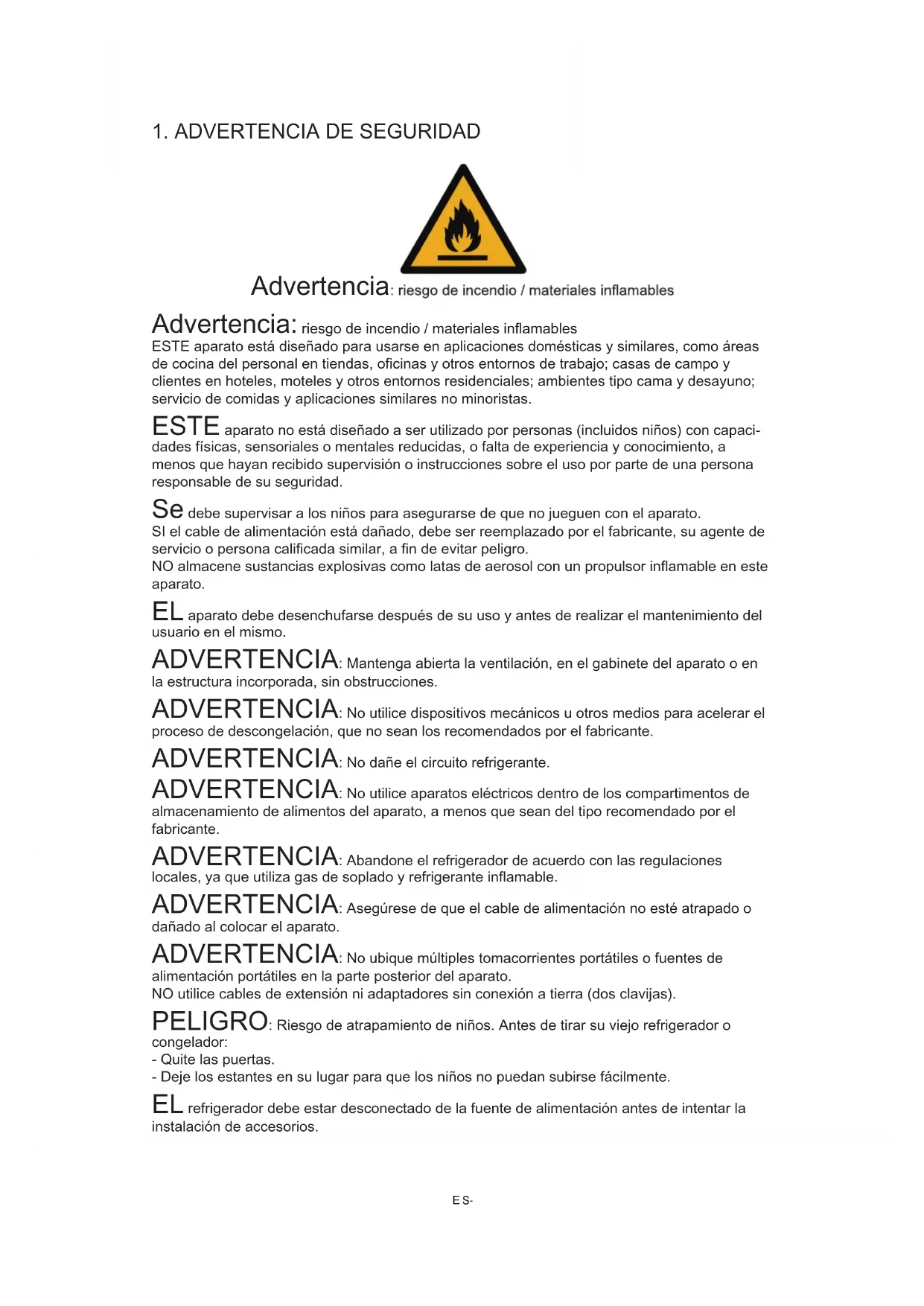 ● No tire del cable de alimentación cuando desconecte el enchufe de alimentación del refrigerador. Sujete rmemente el enchufe y extráigalo directamente del tomacorriente. ● No dañe el cable de alimentación ni lo use cuando esté dañado o desgastado, con el n de garantizar la seguridad en uso. ● Utilice el tomacorriente dedicado en lugar de compartirlo con otros aparatos eléctricos. El enchufe debe estar en contacto con el tomacorriente, de lo contrario, podría producir fuegos. ● Asegúrese de que el electrodo de tierra del tomacorriente esté equipado con una línea de tierra conable. ● Cierre la válvula de escape de gas y luego abra las puertas y ventanas en caso de fuga de gas y otros gases inamables. No desenchufe el refrigerador y otros aparatos eléctricos, ya que la chispa puede provocar un incendio. ● No se permite utilizar los aparatos eléctricos sobre la parte superior del aparato, excepto los del tipo recomendado por el fabricante. ES-31.4 Advertencias para uso ● No desmonte ni reconstruya arbitrariamente el refrigerador, ni dañe el circuito refrigerante; el mantenimiento del aparato debe ser realizado por un especialista ● El cable de alimentación dañado debe ser reemplazado por el fabricante, su departamento de mantenimiento o profesionales relacionados para evitar peligros. ● Debido a que los espacios entre las puertas del refrigerador y entre las puertas y el cuerpo del refrigerador son pequeños, tenga en cuenta que no debe poner la mano en estas áreas para evitar apretar el dedo. Por favor, tenga cuidado al cerrar la puerta del refrigerador para evitar la caída de objetos. ● No recoja alimentos o recipientes con las manos mojadas en la cámara de congelación cuando el refrigerador esté funcionando, especialmente recipientes de metal, para evitar la congelación. ● No permita que ningún niño entre o suba al refrigerador; de lo contrario, se puede causar asxia o caída del niño. ● No coloque objetos pesados sobre la parte superior del refrigerador, ya que los objetos pueden caerse al cerrar o abrir la puerta, e incluso se puede producir lesiones accidentales. ● Retire el enchufe en caso de fallo de alimentación o limpieza. No conecte el refrigerador a la fuente de alimentación dentro de los cinco minutos para evitar daños al compresor debido a arranques sucesivos.