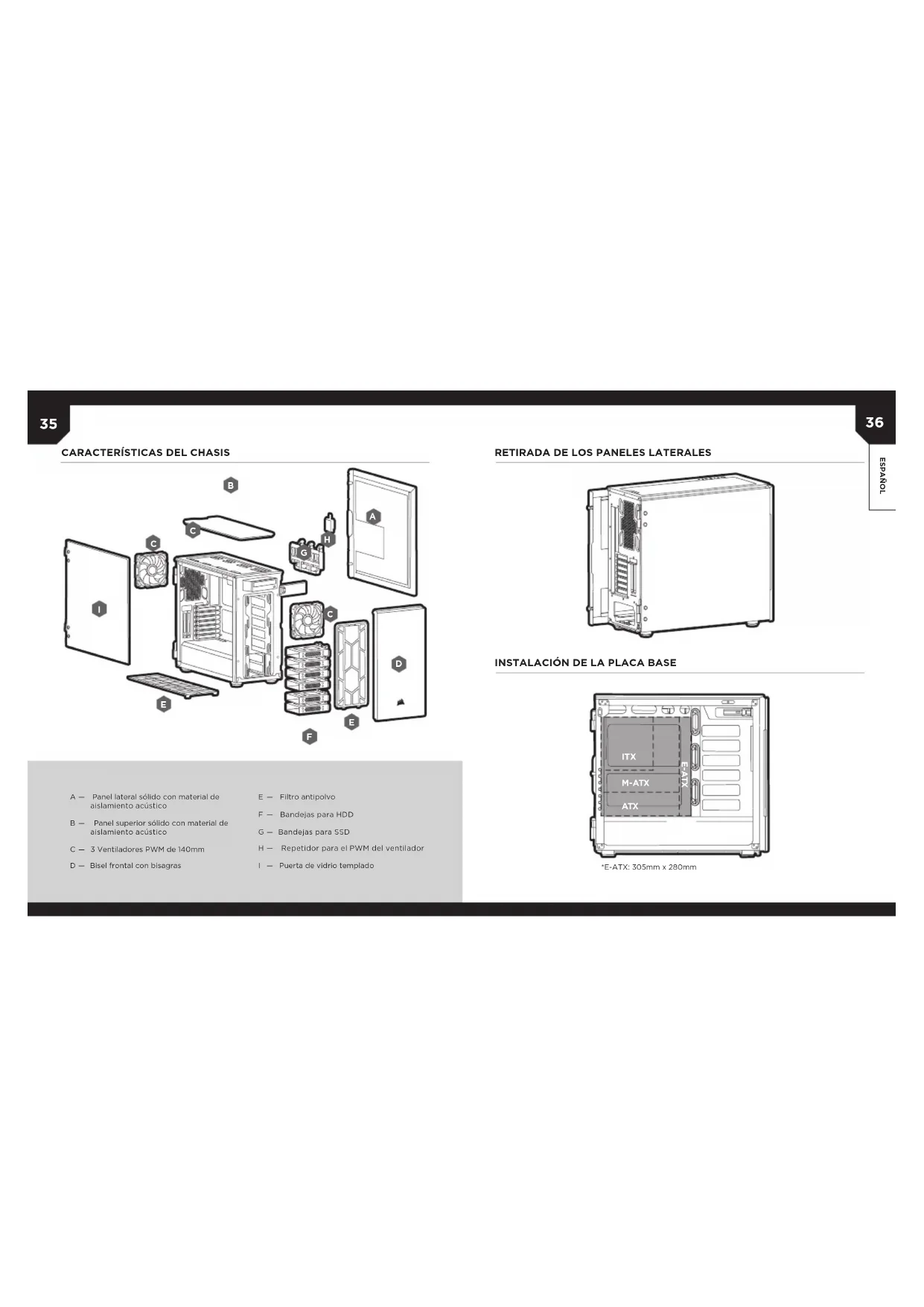 ESPAÑOL RETIRADADELOSPANELESLATERALES INSTALACIÓNDELAPLACABASE CARACTERÍSTICASDELCHASIS A — Panel lateral sólido con material de aislamiento acústico B — Panel superior sólido con material de aislamiento acústico C — 3 Ventiladores PWM de 140mm D — Bisel frontal con bisagras E — Filtro antipolvo F — Bandejas para HDD G — Bandejas para SSD H — Repetidor para el PWM del ventilador I — Puerta de vidrio templado *E-ATX: 305mm x 280mm38