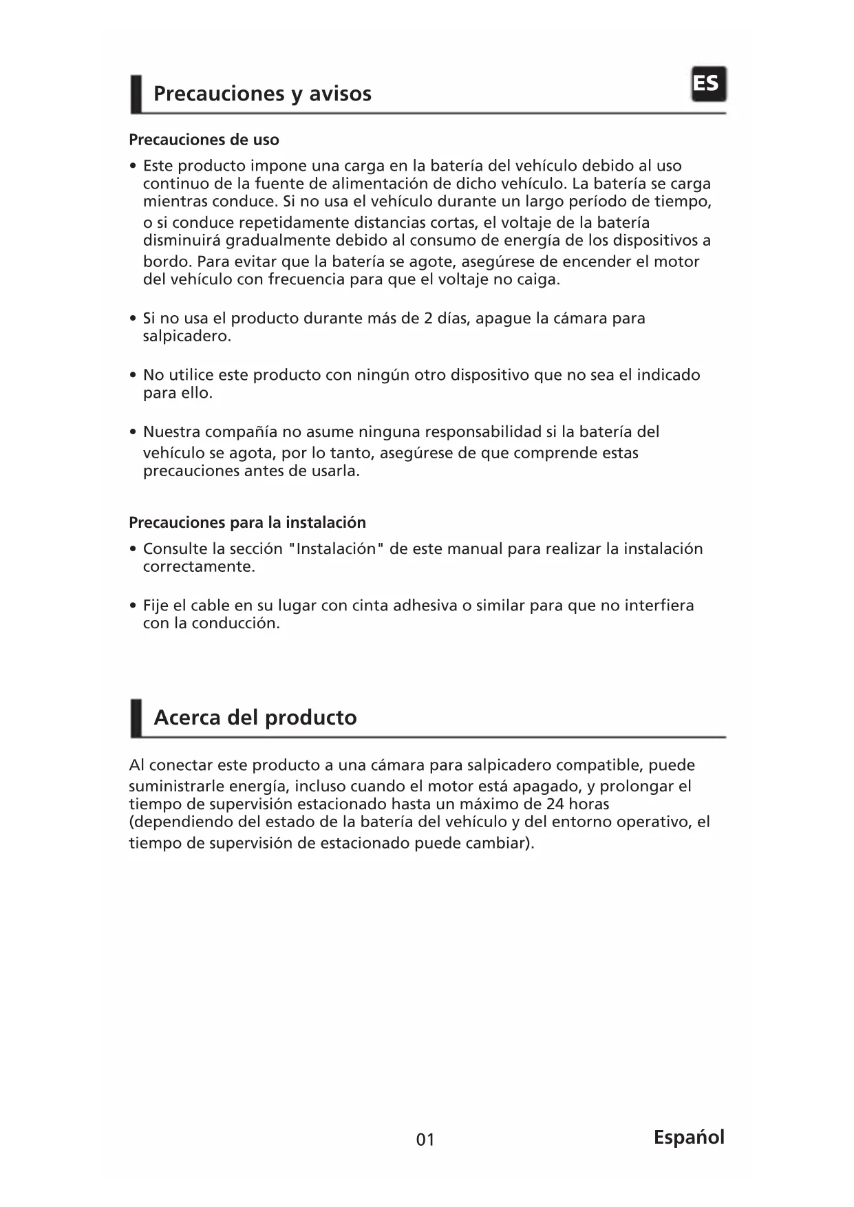 Precauciones de uso Precauciones para la instalación Acerca del producto Al conectar este producto a una cámara para salpicadero compatible, puede suministrarle energía, incluso cuando el motor está apagado, y prolongar el tiempo de supervisión estacionado hasta un máximo de 24 horas (dependiendo del estado de la batería del vehículo y del entorno operativo, el tiempo de supervisión de estacionado puede cambiar).