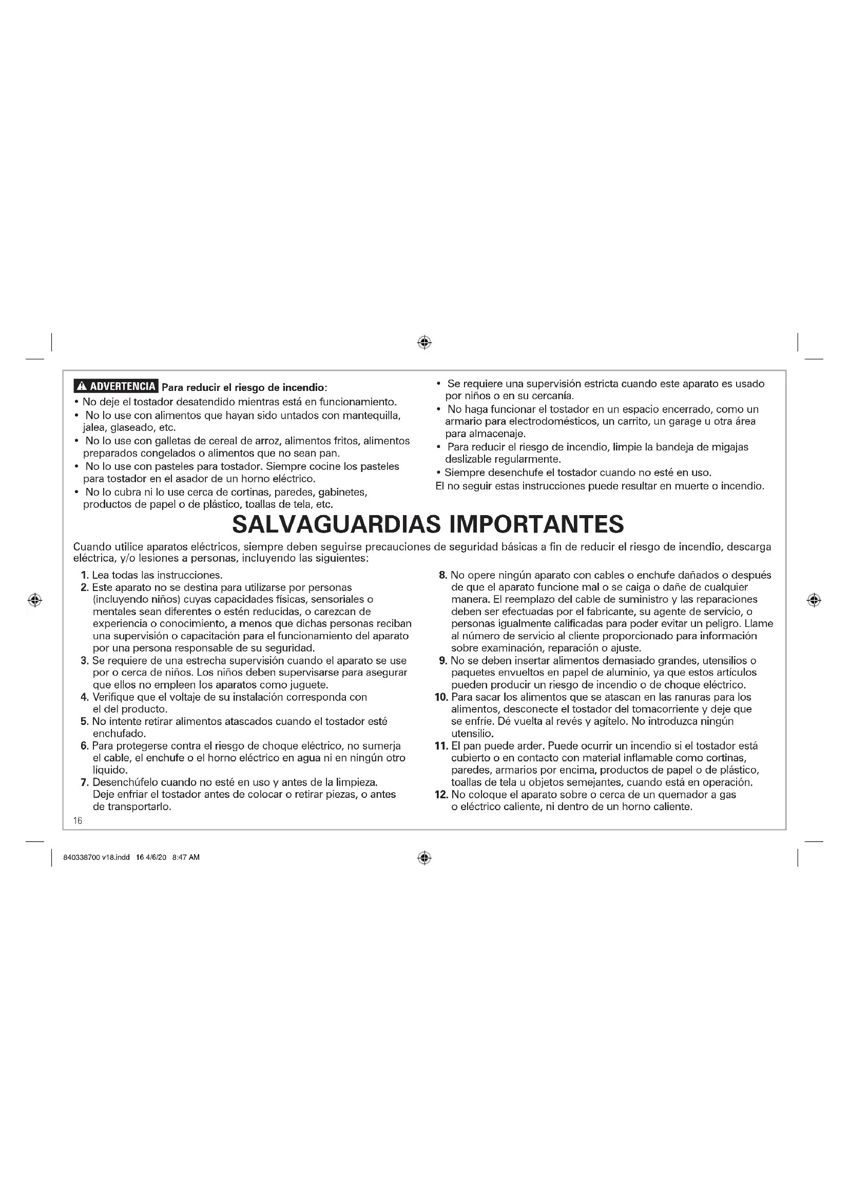 - Siempre desenchufe el tostador cuando no esté en uso. El no seguir estas instrucciones puede resultar en muerte o incendio. 840338700 v18.indd 16 4/6/20 8:47 AM17 Otra información de seguridad para el consumidor Este aparato ha sido diseñado solamente para uso doméstico. w ADVERTENCIA Riesgo de descarga eléctrica: Este aparato es provisto con un enchufe polarizado (una pata más ancha) para reducir el riesgo de una descarga eléctrica. El enchufe embona únicamente en una dirección dentro de un tomacorriente polarizado. No trate de obviar el propósito de seguridad del enchufe modificándolo de alguna manera o utilizando un adaptador. Si el enchufe no entra completamente en la toma, invierta el enchufe. Si aún no entra, haga que un electricista reemplace la toma. El largo del cable que se usa en este aparato fue seleccionado para reducir el peligro de que alguien se enganche o tropiece con un cable más largo. Si es necesario usar un cable más largo, se podrá usar un cable de extensión aprobado. La clasificación eléctrica nominal del cable de extensión debe ser igual o mayor que la clasificación nominal del aparato. Es importante tener cuidado de colocar el cable de extensión para que no se pliegue sobre el mostrador o la mesera en donde niños puedan tirar del mismo o tropezarse accidentalmente. Para evitar una sobrecarga del circuito eléctrico, no use otro aparato de alto voltaje en el mismo circuito con este aparato.