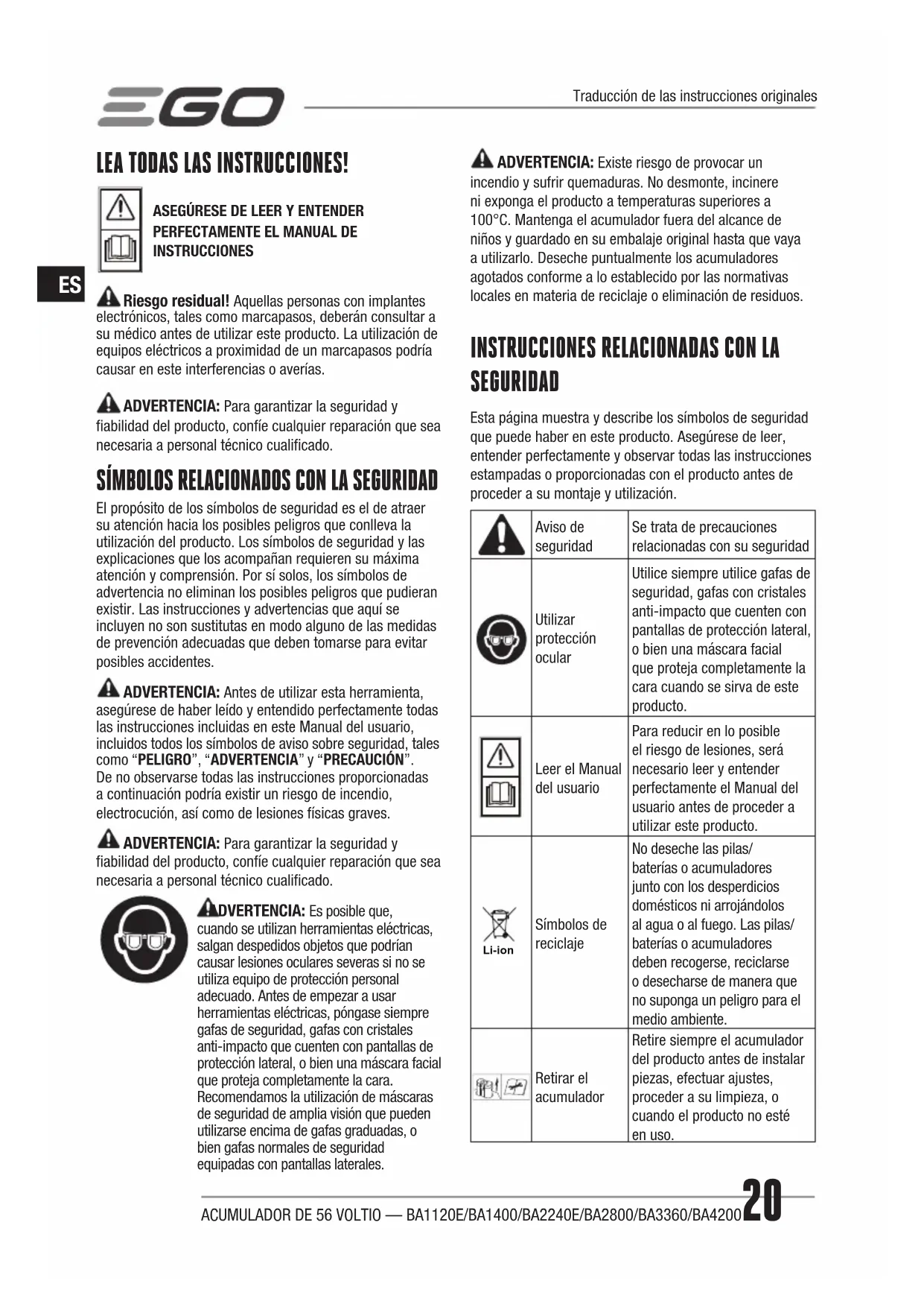 BA1120E - Batería EGO - Manual de uso y guía de instrucciones gratis