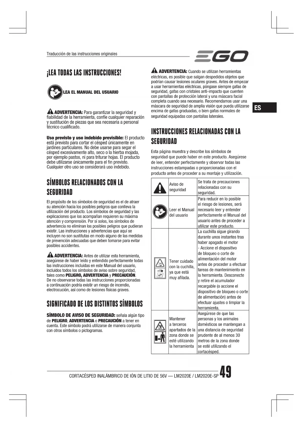 SEGURIDAD Esta página muestra y describe los símbolos de seguridad que puede haber en este producto. Asegúrese de leer, entender perfectamente y observar todas las instrucciones estampadas o proporcionadas con el producto antes de proceder a su montaje y utilización. Aviso de seguridad Se trata de precauciones relacionadas con su seguridad. Leer el Manual del usuario Para reducir en lo posible el riesgo de lesiones, será necesario leer y entender perfectamente el Manual del usuario antes de proceder a utilizar este producto. Tener cuidado con la cuchilla, ya que está muy alada. La cuchilla sigue girando durante unos instantes tras haber apagado el motor - Accione el dispositivo de bloqueo o corte de alimentación del motor antes de proceder a efectuar tareas de mantenimiento en la herramienta. Desconecte y retire el acumulador recargable (o accione el dispositivo de bloqueo o corte de alimentación) antes de efectuar ajustes o limpiar la herramienta. Mantener a terceros apartados de la zona donde se esté utilizando la herramienta Asegúrese de que las personas y los animales domésticos se mantengan a una distancia de seguridad prudente de al menos 30 metros de la zona donde se esté utilizando el cortacésped. Traducción de las instrucciones originalesCORTACÉSPED INALÁMBRICO DE IÓN DE LITIO DE 56V — LM2020E / LM2020E-SP50