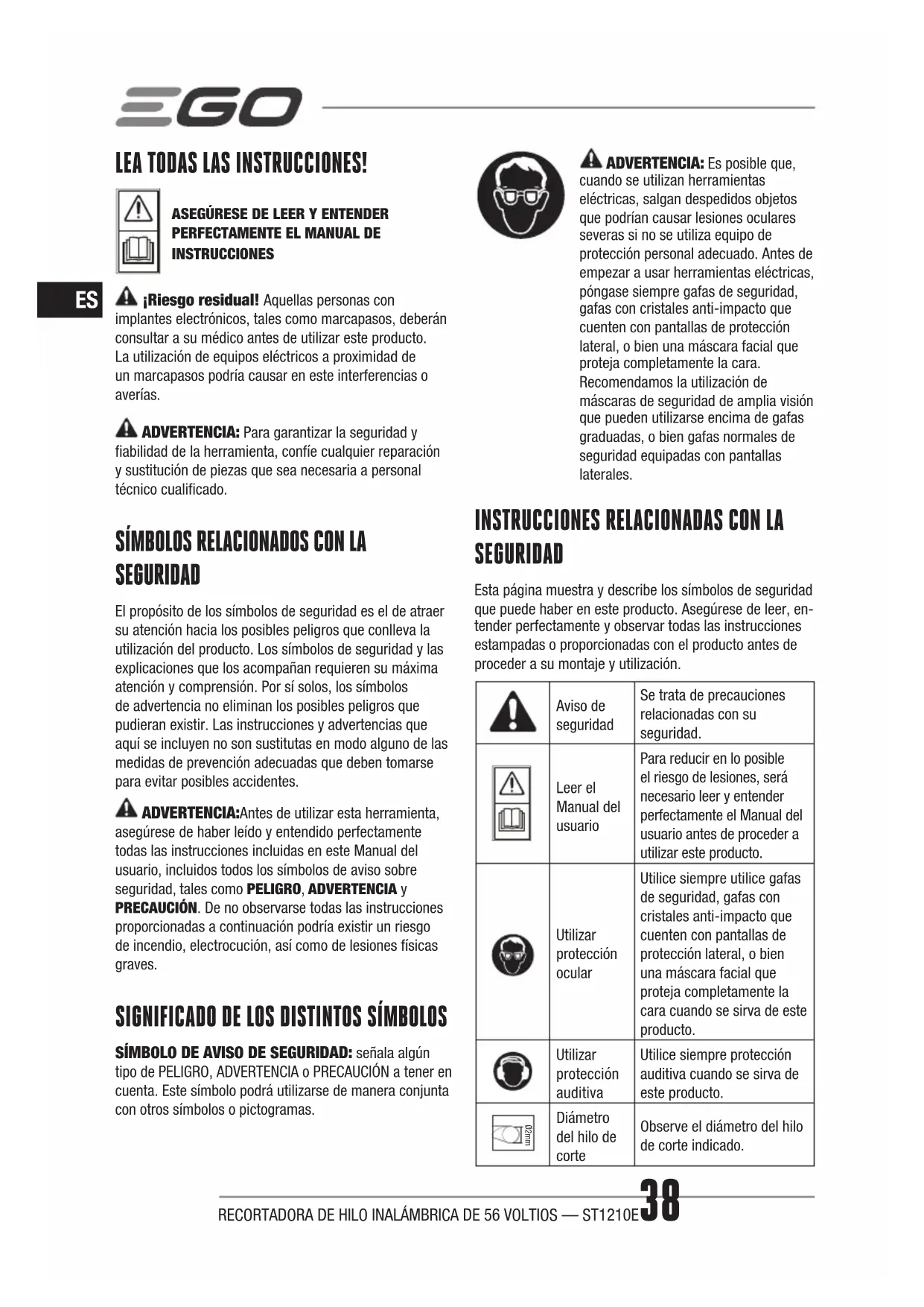 SEGURIDAD Esta página muestra y describe los símbolos de seguridad que puede haber en este producto. Asegúrese de leer, en- tender perfectamente y observar todas las instrucciones estampadas o proporcionadas con el producto antes de proceder a su montaje y utilización. Aviso de seguridad Se trata de precauciones relacionadas con su seguridad. Leer el Manual del usuario Para reducir en lo posible el riesgo de lesiones, será necesario leer y entender perfectamente el Manual del usuario antes de proceder a utilizar este producto. Utilizar protección ocular Utilice siempre utilice gafas de seguridad, gafas con cristales anti-impacto que cuenten con pantallas de protección lateral, o bien una máscara facial que proteja completamente la cara cuando se sirva de este producto. Utilizar protección auditiva Utilice siempre protección auditiva cuando se sirva de este producto. Ø2mm Diámetro del hilo de corte Observe el diámetro del hilo de corte indicado.RECORTADORA DE HILO INALÁMBRICA DE 56 VOLTIOS — ST1210E