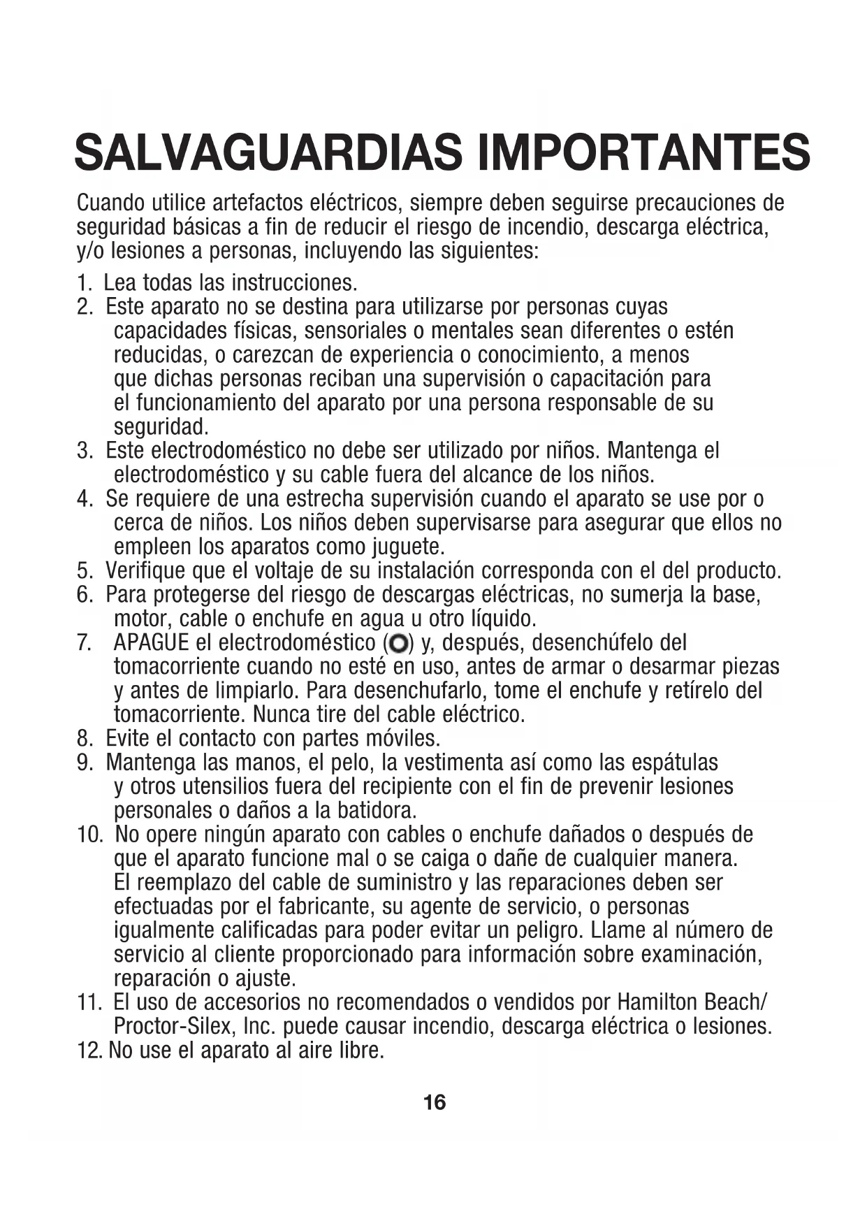 11. El uso de accesorios no recomendados o vendidos por Hamilton Beach/