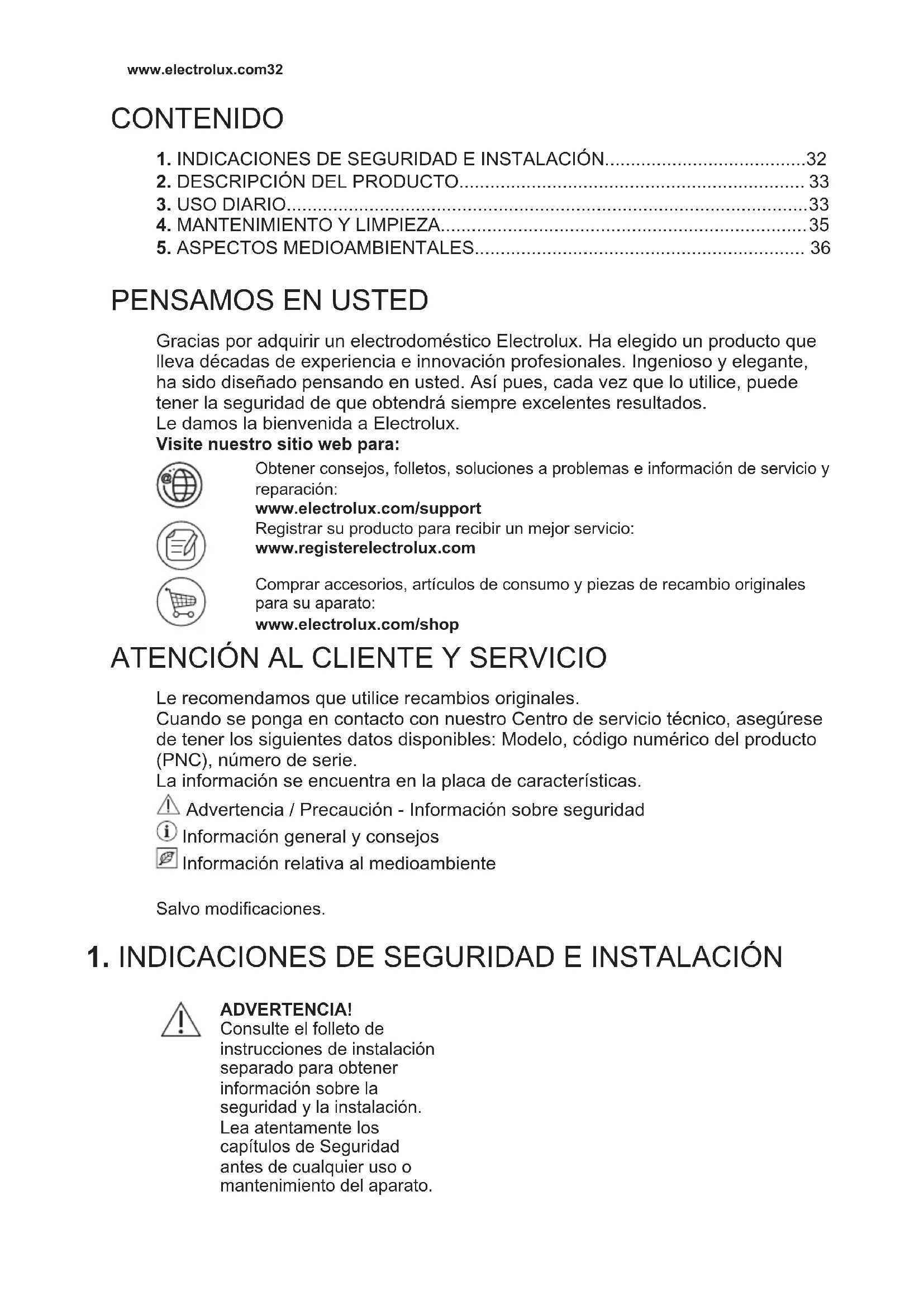 Gracias por adquirir un electrodoméstico Electrolux. Ha elegido un producto que lleva décadas de experiencia e innovación profesionales. Ingenioso y elegante, ha sido diseñado pensando en usted. Así pues, cada vez que lo utilice, puede tener la seguridad de que obtendrá siempre excelentes resultados. Le damos la bienvenida a Electrolux. Visite nuestro sitio web para: Obtener consejos, folletos, soluciones a problemas e información de servicio y reparación: www.electrolux.com/support Registrar su producto para recibir un mejor servicio: www.registerelectrolux.com Comprar accesorios, artículos de consumo y piezas de recambio originales para su aparato: www.electrolux.com/shop