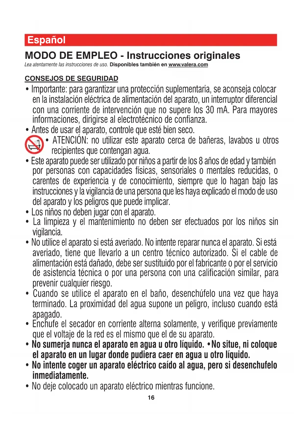 - ATENCIÓN: no utilizar este aparato cerca de bañeras, lavabos u otros recipientes que contengan agua.
