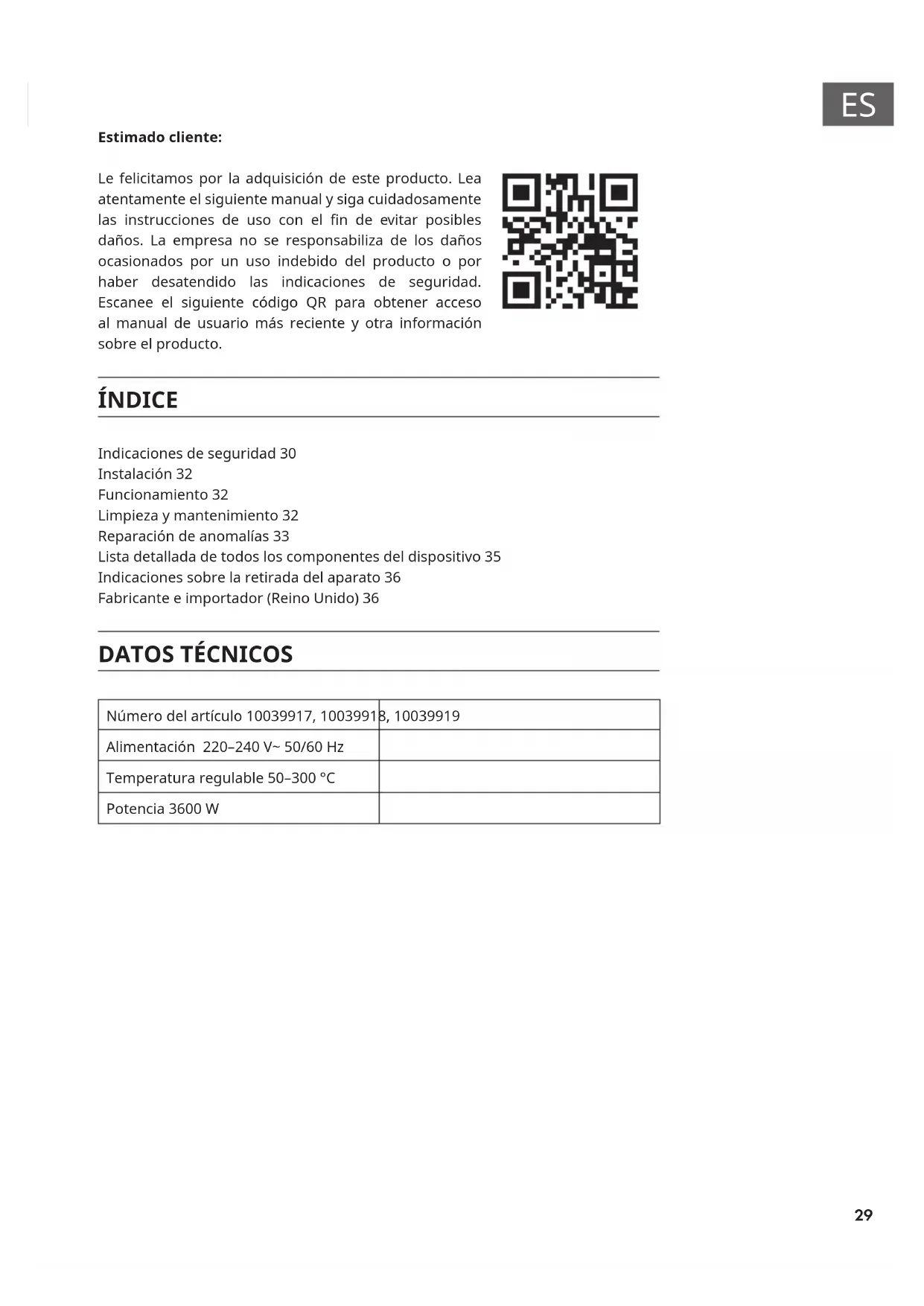 Estimado cliente: Le felicitamos por la adquisición de este producto. Lea atentamente el siguiente manual y siga cuidadosamente las instrucciones de uso con el n de evitar posibles daños. La empresa no se responsabiliza de los daños ocasionados por un uso indebido del producto o por haber desatendido las indicaciones de seguridad. Escanee el siguiente código QR para obtener acceso al manual de usuario más reciente y otra información sobre el producto. ÍNDICE Indicaciones de seguridad 30 Instalación 32 Funcionamiento 32 Limpieza y mantenimiento 32 Reparación de anomalías 33 Lista detallada de todos los componentes del dispositivo 35 Indicaciones sobre la retirada del aparato 36 Fabricante e importador (Reino Unido) 36