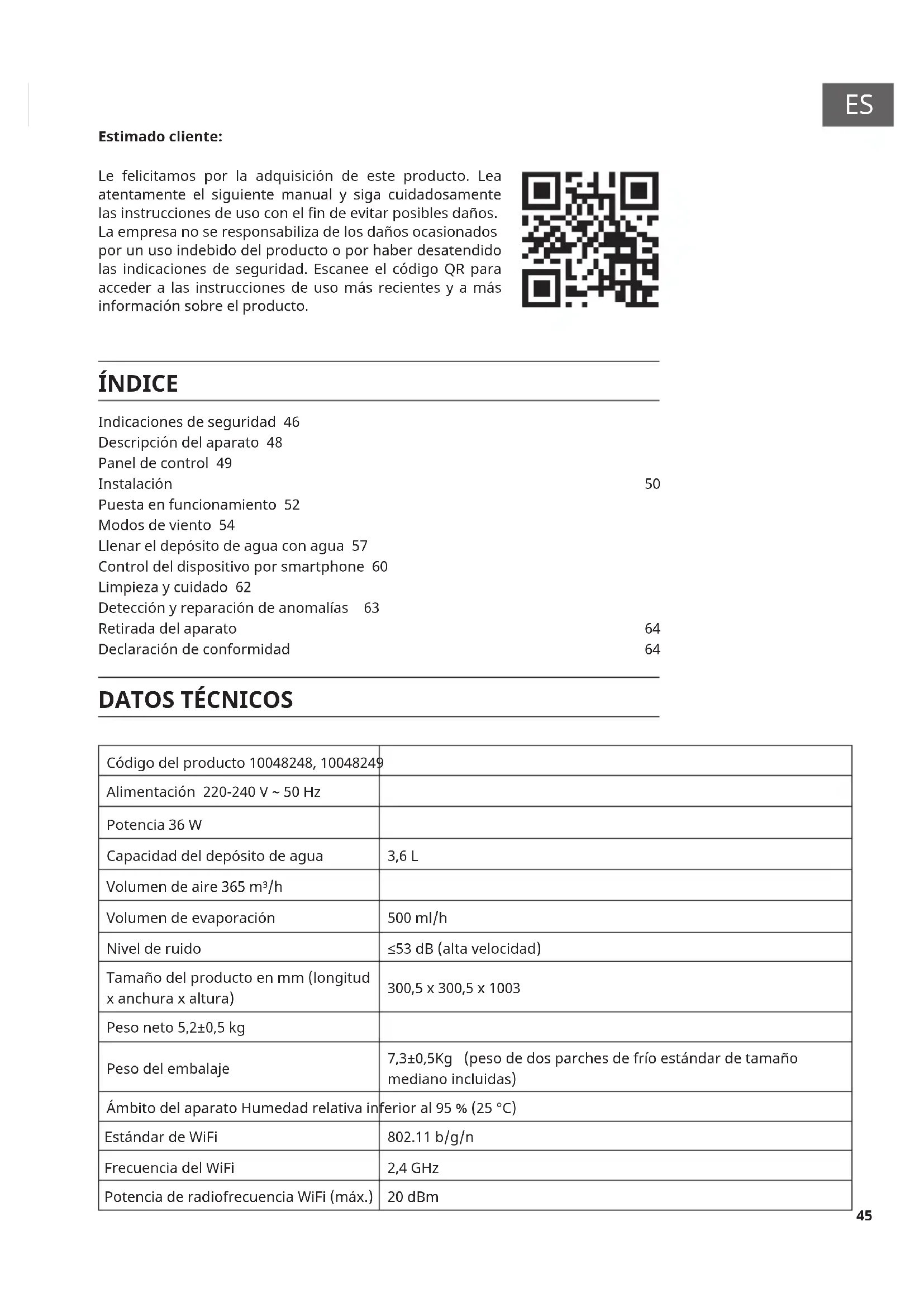 Frecuencia del WiFi 2,4 GHz PotenciaderadiofrecuenciaWiFi(máx.) 20 dBm Indicaciones de seguridad 46 Descripción del aparato 48 Panel de control 49 Instalación 50 Puesta en funcionamiento 52 Modos de viento 54 Llenar el depósito de agua con agua 57 Control del dispositivo por smartphone 60 Limpieza y cuidado 62 Detecciónyreparacióndeanomalías 63 Retirada del aparato 64 Declaración de conformidad 6446